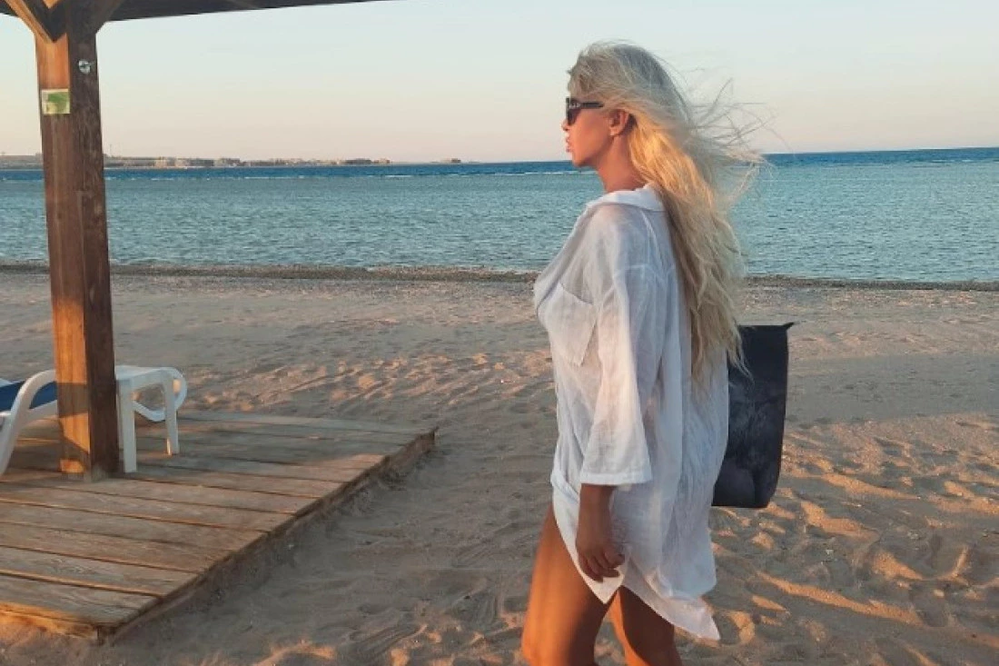 Na slici pozira pored mora, pokazujući vitku figuru i zavidnu formu.