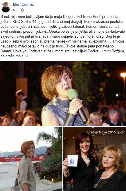 – S neizmernom boli javljam da je moja ljubljena kći Ivana Burić preminula juče u KBC Split u 44. godini. Bila si moj dragulj, tvoja prekrasna poetska duša, puna ljubavi i nežnosti, veliki muzički talenat, humor…činile su naš život srećnim, prepun ljubavi…Opaka bolest je pretila, ali smo je savladavale zajedno…Ovaj put je bila jača, nismo uspele, sunce moje i dragi Bog te je uzeo k sebi u svoj zagrljaj, prema nebeskim visinama, zvezdama, a tvojoj neutešnoj majci ostavio najdublju tugu… Tvoje stotine puta ponavljano “mami, I love you” odzvanjaće u mom srcu zauvek! Počivaj u miru Božjem, najdraža moja Ivi, napisala je neutešna pevačica na Fejsbuku.