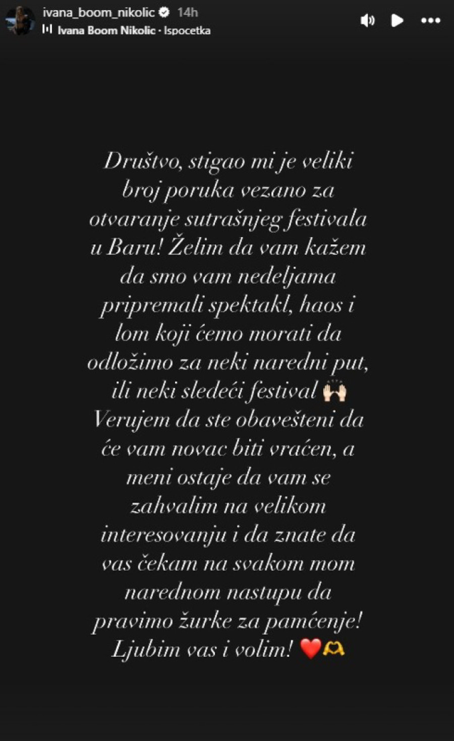 - Dragi moji, žao mi je što se, zbog neispunjenih uslova da se koncert održi, nećemo družiti u Baru 7. avgusta. Kao što već znate, moj raspored koncerata je veoma gust i nemam taj luksuz da mi se datum koncerata pomera za po dan, dva, pet, niti znam razlog tome, niti mi se iz dana u dan saopštava druge lokacije koncerata... Smatram da je za dobar koncert potrebna i dobra organizacija i da moja publika zaslužuje samo najbolje. Organizatori su dužni da vam vrate novac od prodatih karata - poručila je ona.