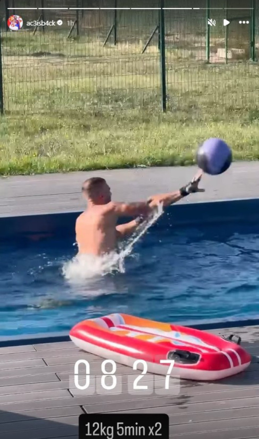 Ražnatović je objavio snimak na kom stoji u bazenu dok hvata i vraća nazad loptu tešku 12 kilograma. Kako je kretanje u vodi otežano, tako mu to stvara dodatan teret i vežba je zahtevnija nego kada bi se izvodila van vode.