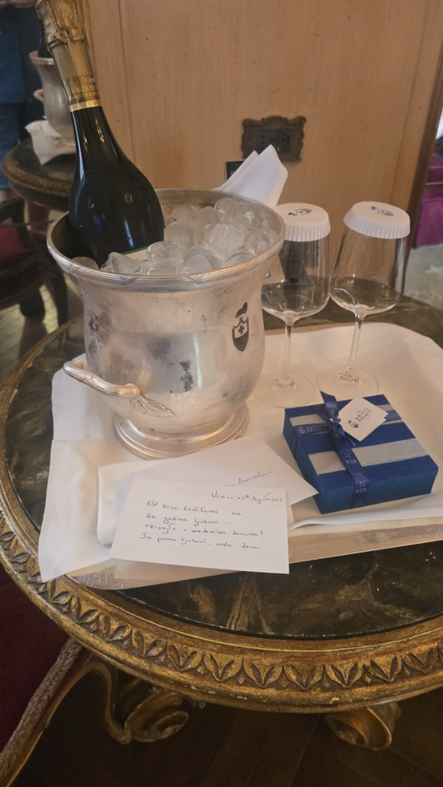 Na poklon su dobili putovanje u grad romantičnih kanala, uz luksuzni smeštaj u čuvenom hotelu, gde noćenje košta preko 1 500 evra. Kada su ušli u svoju sobu sa pogledom na Veliki kanal, dočekali su ih šampanjac, jagode u čokoladi i emotivna poruka.