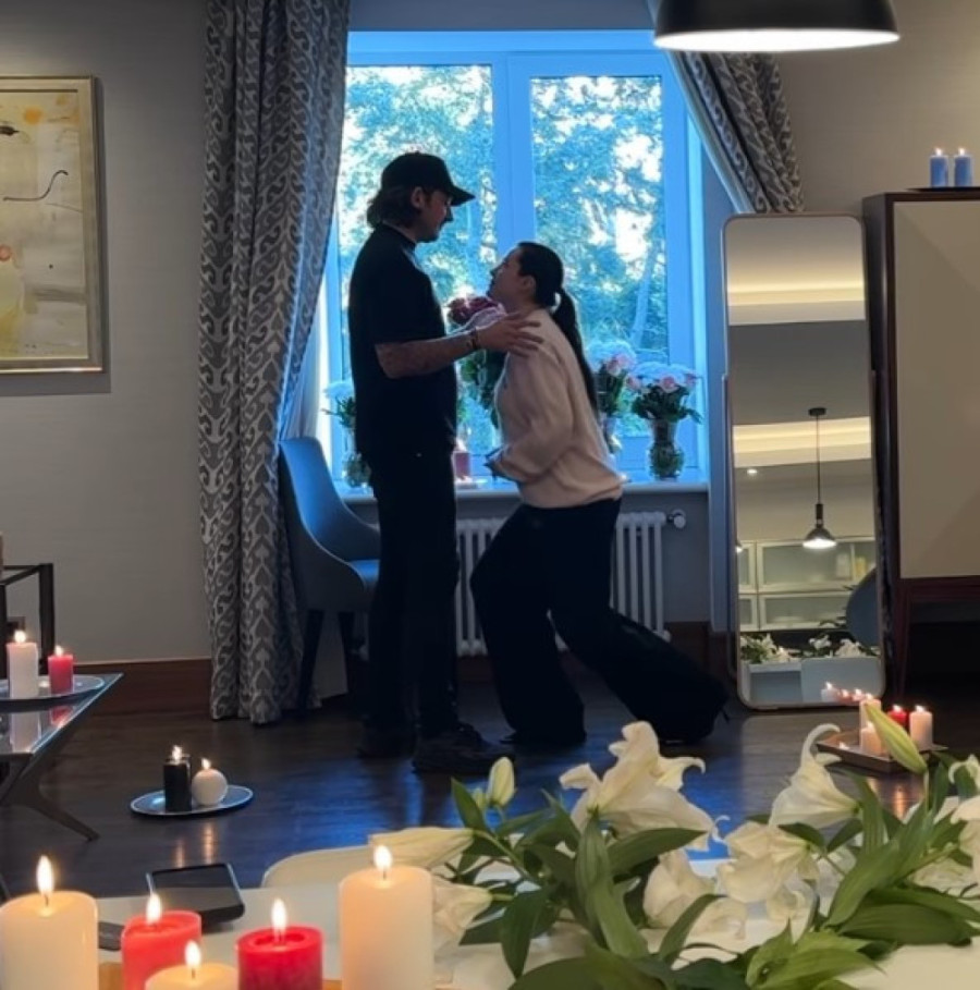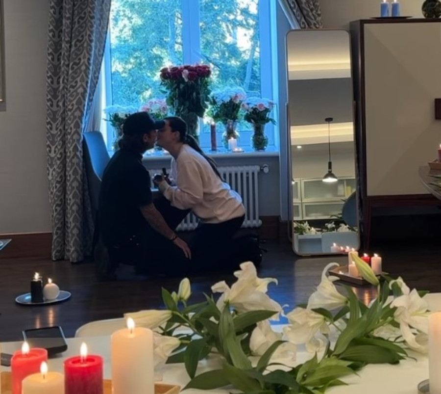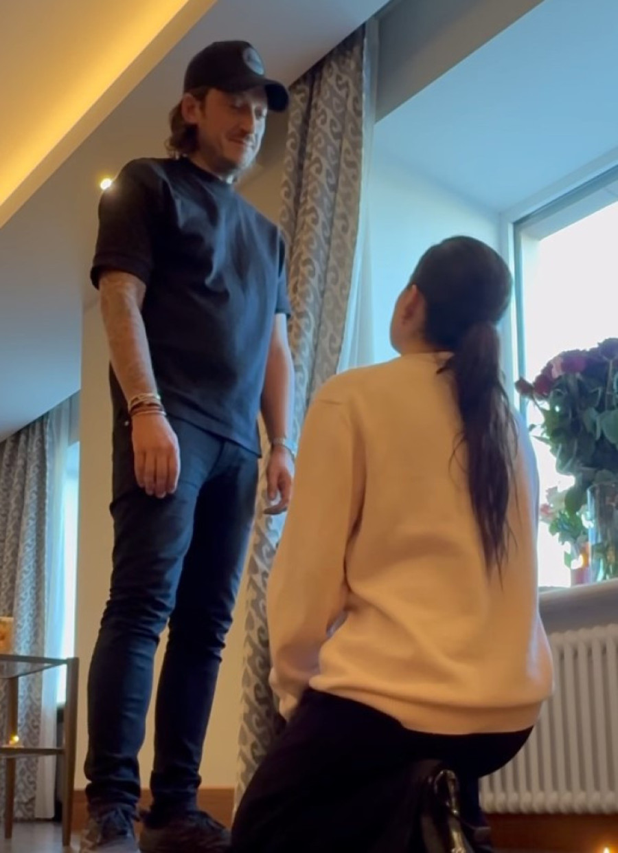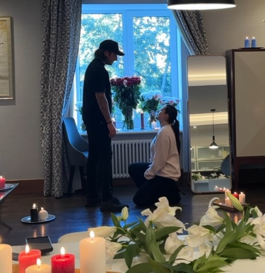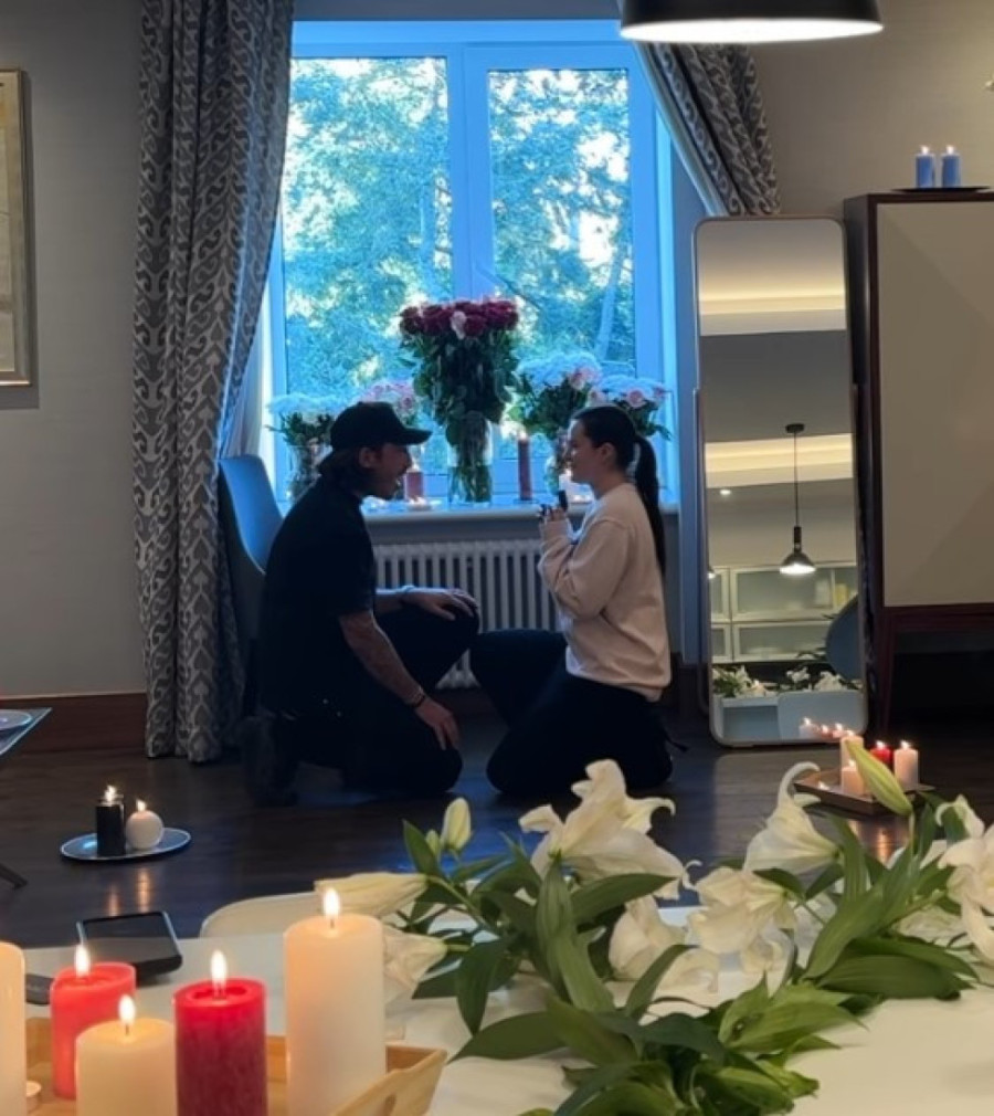Na snimcima se vidi kako Bela kleči ispred Emsa i poklanja mu prsten u kutiji, dok romantičnu atmosferu upotpunjuju sveće, cvetne dekoracije i crveni baloni u obliku srca sa natpisom „Volim te“.