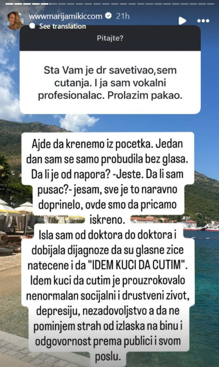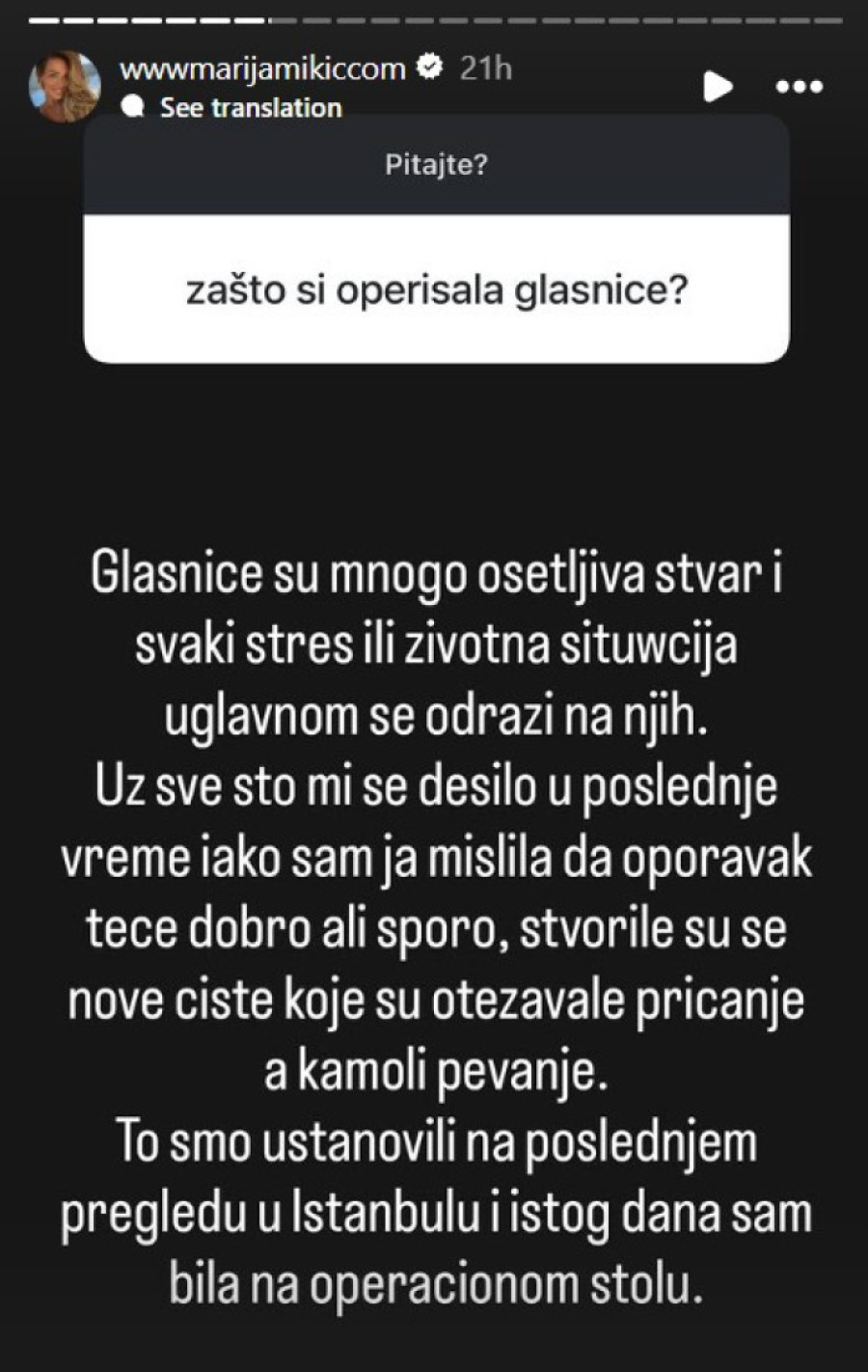 Pevačica Marija Mikić otvorila je dušu i podelila sa javnošću detalje ozbiljnih zdravstvenih problema sa kojima se suočavala proteklih meseci, otkrivši da je imala tri teške operacije glasnih žica, od kojih je poslednja obavljena u Istanbulu.