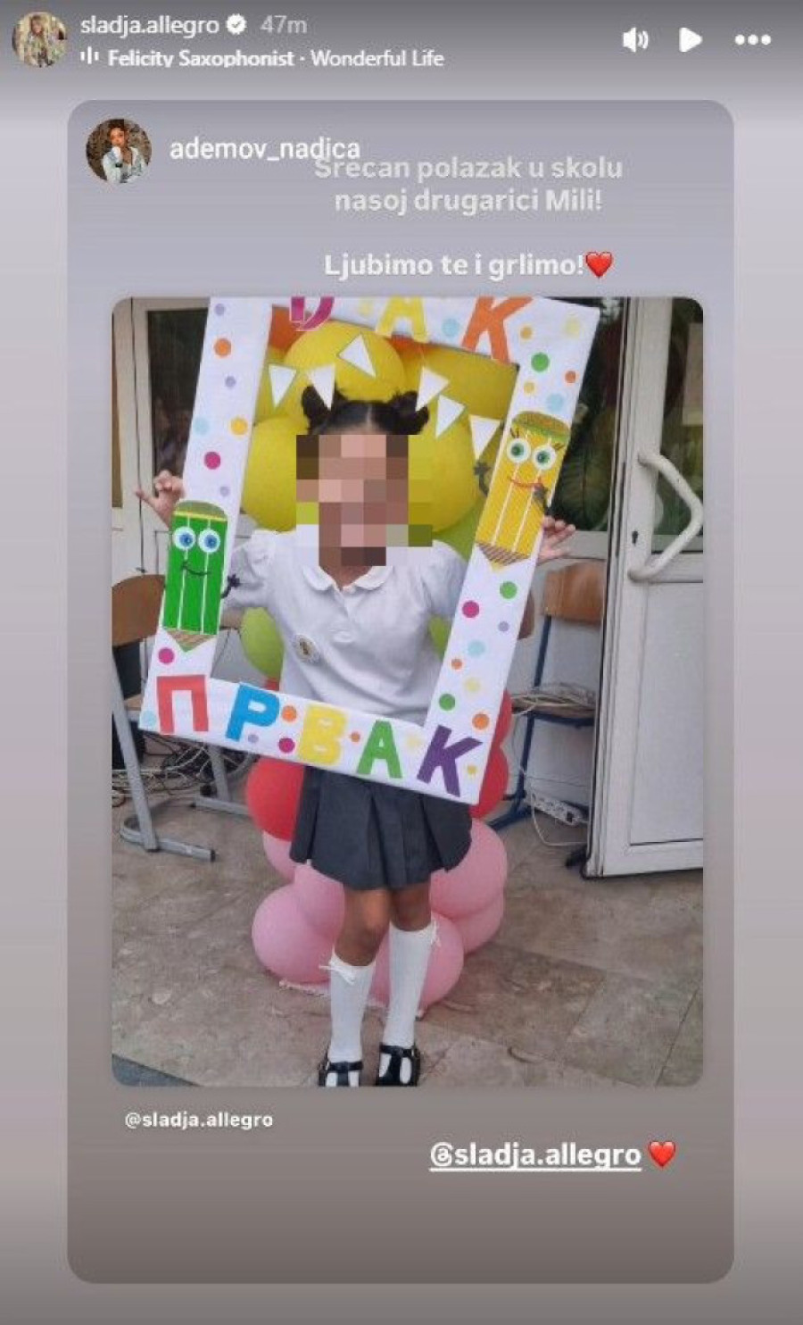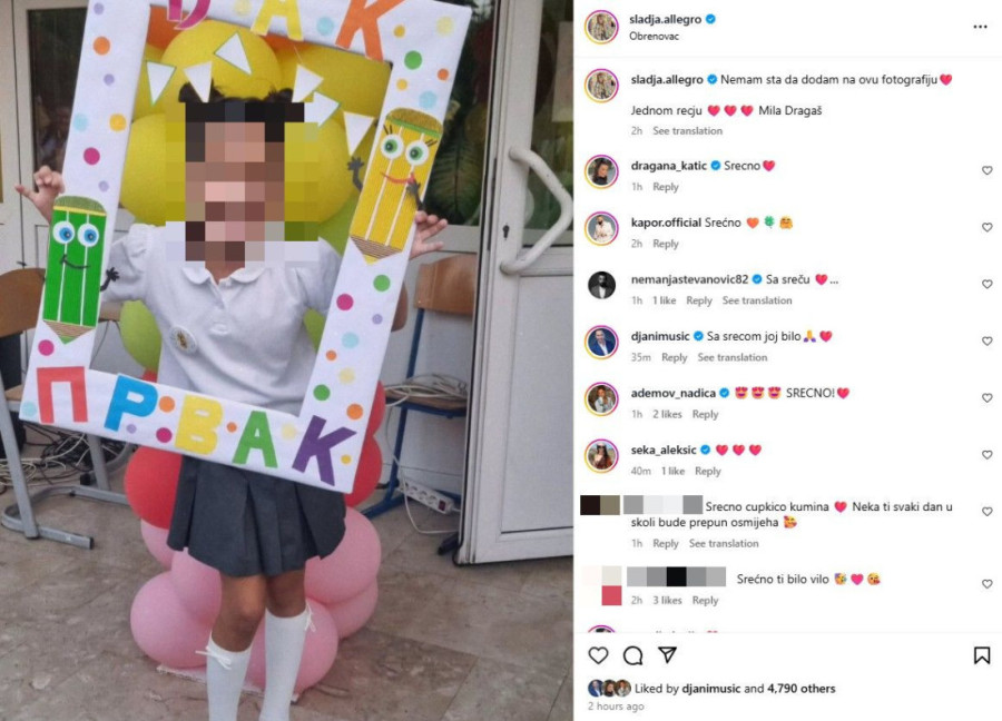 Slađana i Zoran Dragaš ispratili su danas ćerku Milu u prvi razred. Pevačica Slađa Alegro tim povodom objavila je nekoliko fotografija svog đaka prvaka na društvenim mrežama, pa izmamila i more lepih želja i poznatih prijatelja poput Nadice Ademov, Radiše Trajkovića Đanija, Saše Kapora i drugih.
