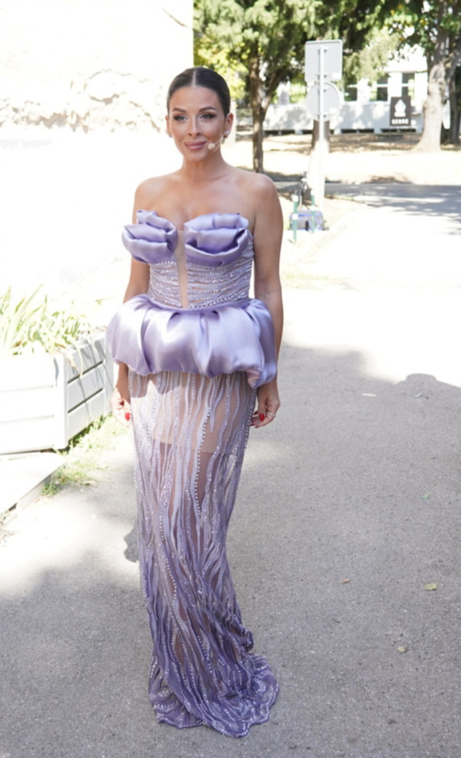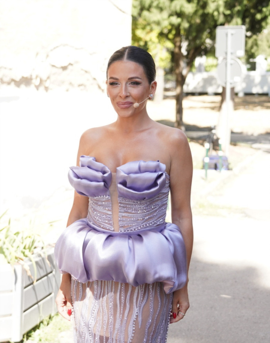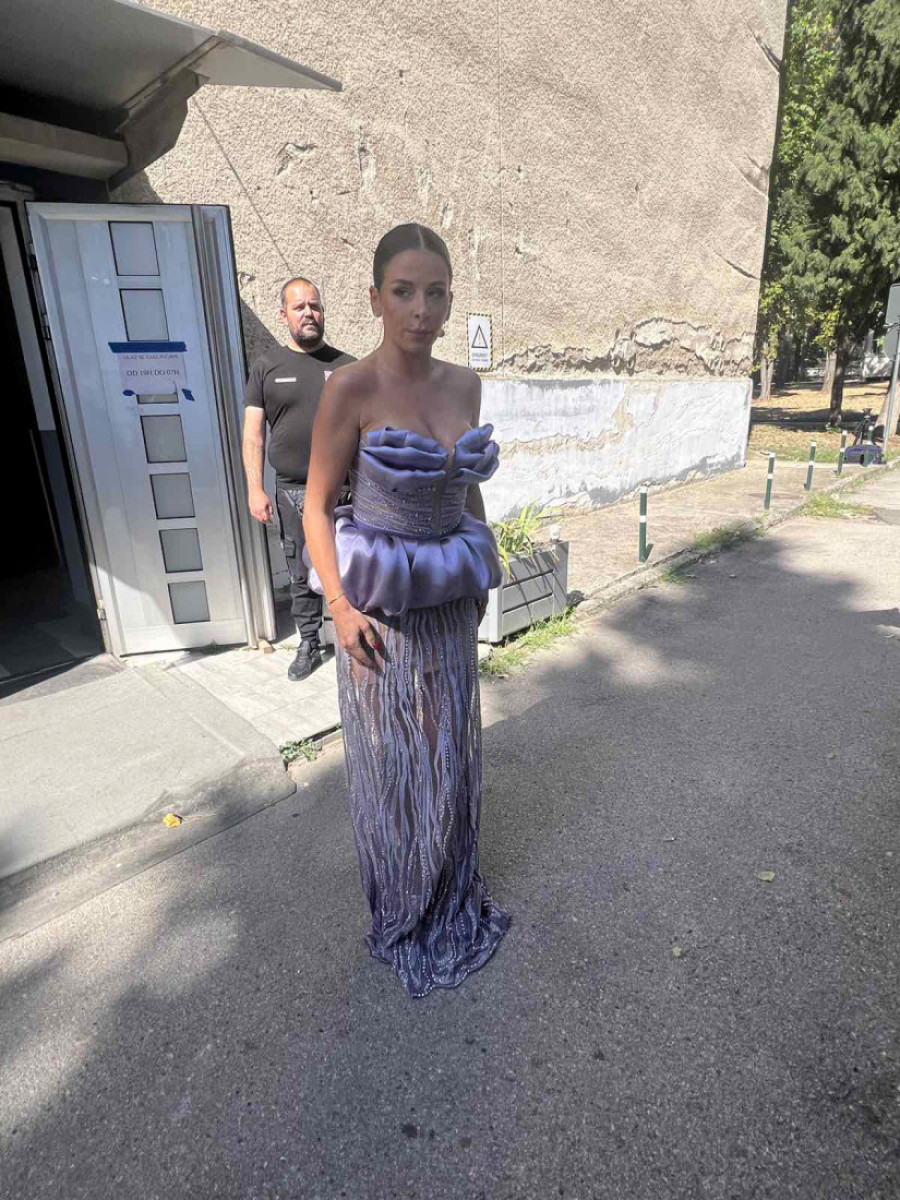 Za prvi dan snimanja Ana je želela da ostavi snažan utisak, pa se pojavila u neočekivanoj kreaciji. Haljina je, kako saznajemo, ručni rad i unikat – gornji deo krase laticama oblikovani detalji koji naglašavaju dekolte, dok struk dodatno ističe pojas od istog materijala.