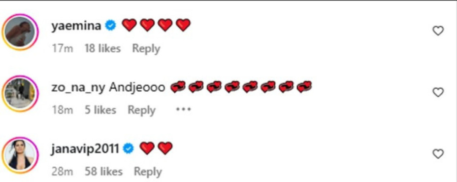 Nataša Bekvalac ostavila je srca u komentaru, a pridružile su joj se i Jelisaveta Orašanin, Katarina Grujić, Emina Jahović, Jana Todorović, dok je Sandra Afrika napisala kratko i dirljivo – „zdrava i živa bila“. Posebno emotivna bila je poruka bake Zorice Nakić, Filipove majke, koja je za unuku napisala – „Anđeo“.