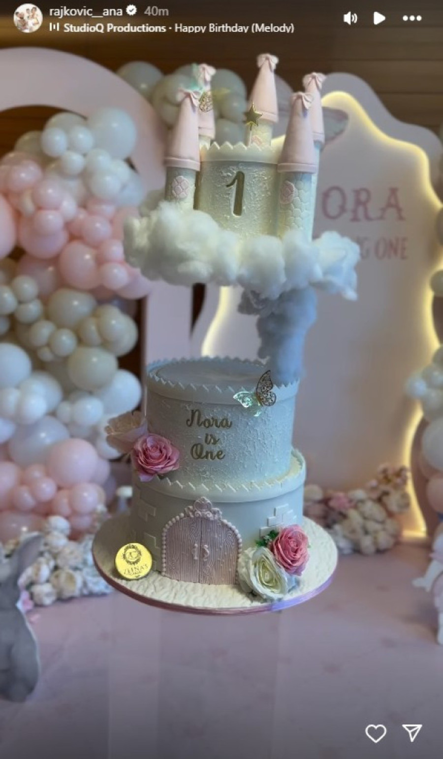 Torta je, naime, bila u obliku dvorca, ali tako da je kupola bila na postolju koje je izgledalo kao da je na obliku. Boje na torti su bile bela i nežno roze, sa ružama kao ukras, a na vrhu je pisao broj 1, koji označava i koliko godina Nora sada puni.