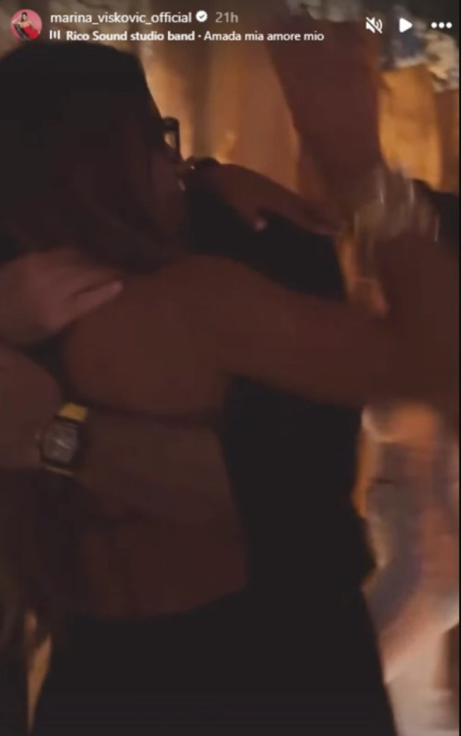 Na snimku se vidi da su sve vreme bili zagrljeni, a on je pevačicu čvrsto držao u naručju, ne ispuštajući je ni na tren. Marina je blistala u elegantnoj haljini sa golim leđima, dok je u pozadini odzvanjala pesma sa stihovima „Amada mia, amore mio“ – „Draga moja, ljubavi moja“.
