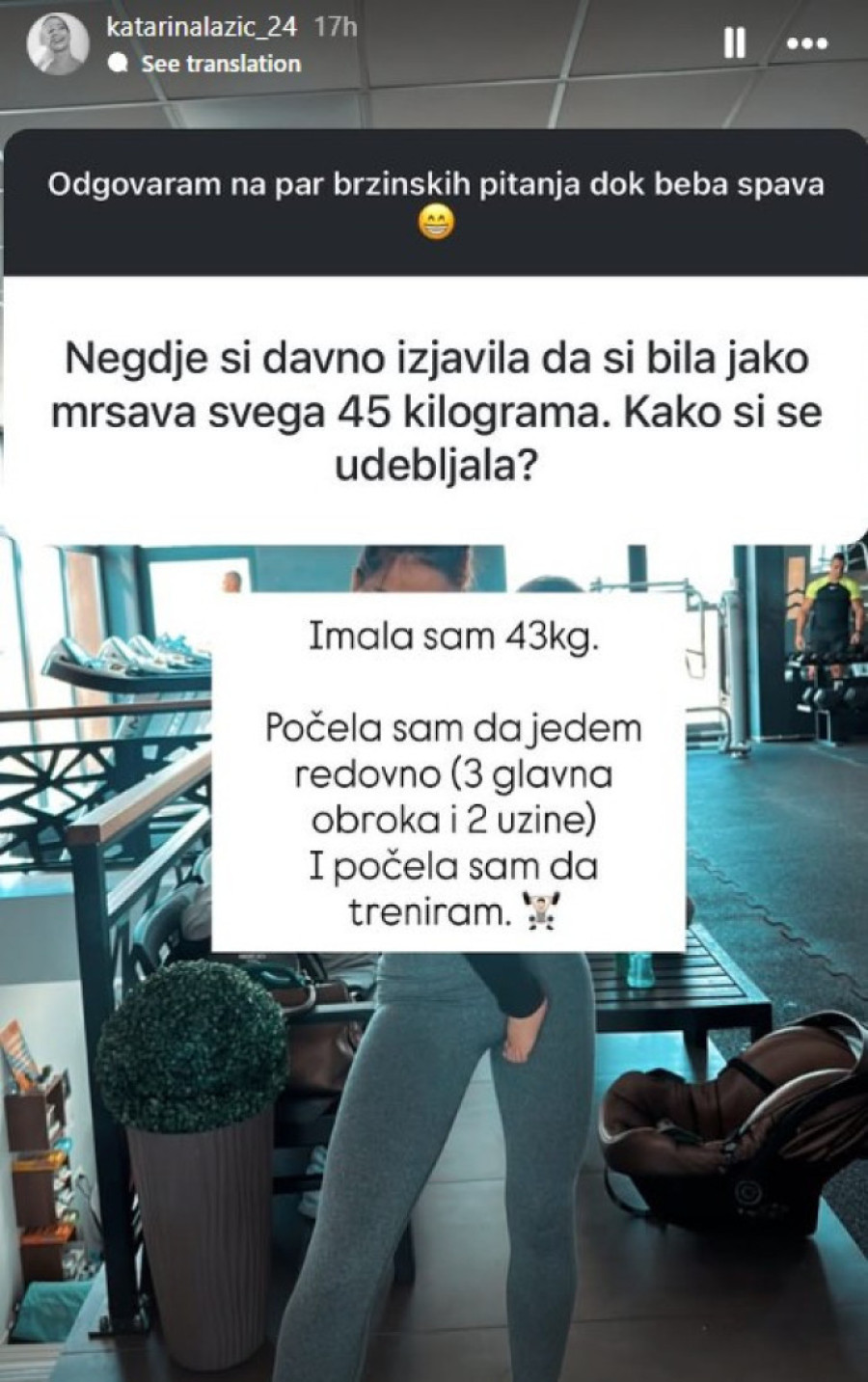 - Imala sam 43 kg. Počela sam da jedem redovno, tri glavna obroka i dve užine. I počela sam da treniram - navela je Darkova supruga. Katarina je na mrežama otkrila i koliko je visoka.