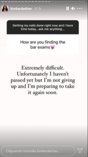 Kim Kardašijan ne odustaje od svog sna da postane pravnica. Kako je i njen otac veoma zapažen u ovoj oblasti, ona je rešila da mu osvetla obraz i nastavi njegovim stopama. Rijaliti zvezdu su pratioci na Instagramu uputili kako je polagati ispite na Pravnom fakultetu, a ona im je odgovorila da to nije nimalo lak zadatak.