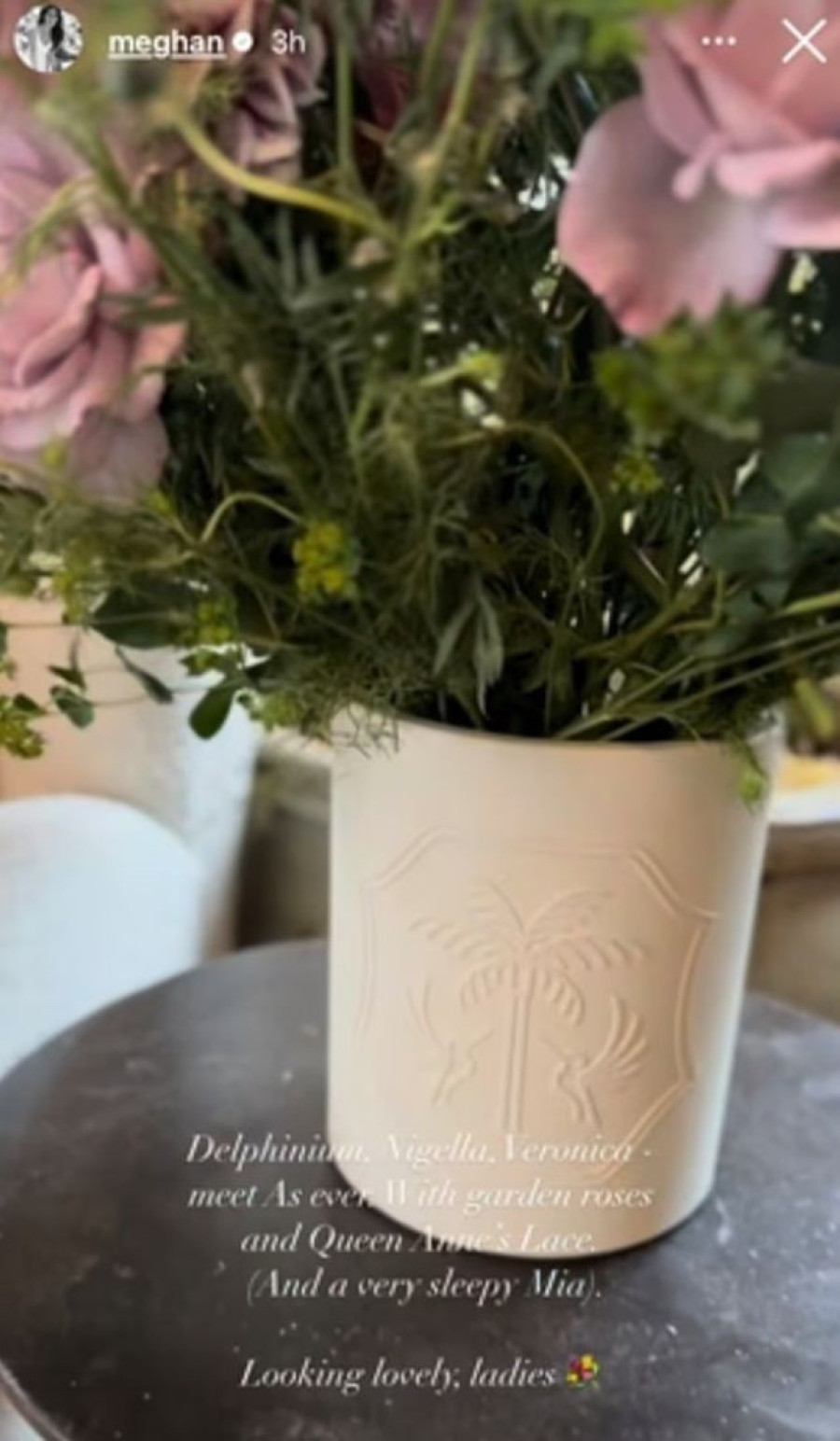 Baštenske ruže u njenoj "As ever" vazi postavljenoj na stočić pored fotelje, kao što možete videti i u galeriji koja sledi, bile su uparene sa cvetovima divlje šargarepe, istakla je Marklova na društvenim mrežama. Odmah pored - vidi se i dalje vrlo popularni "Hermes" prekrivač vredan 2.000 dolara.