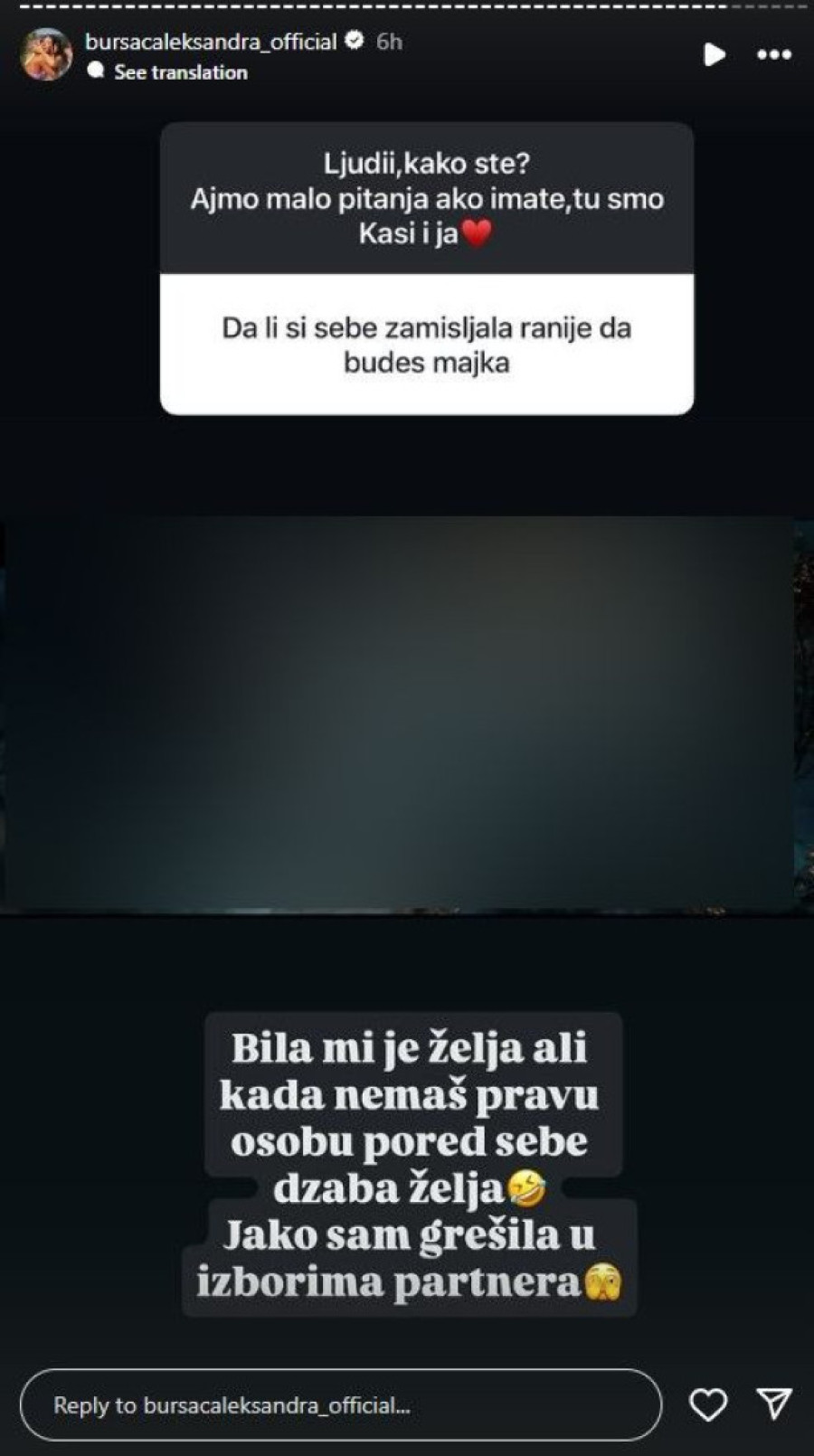 Ona je nedavno odgovarala na pitanja fanova sa Instagrama, te je tom prilikom progovorila o trudnoći, porođaju, ali i o pogrešnom odabiru partnera.