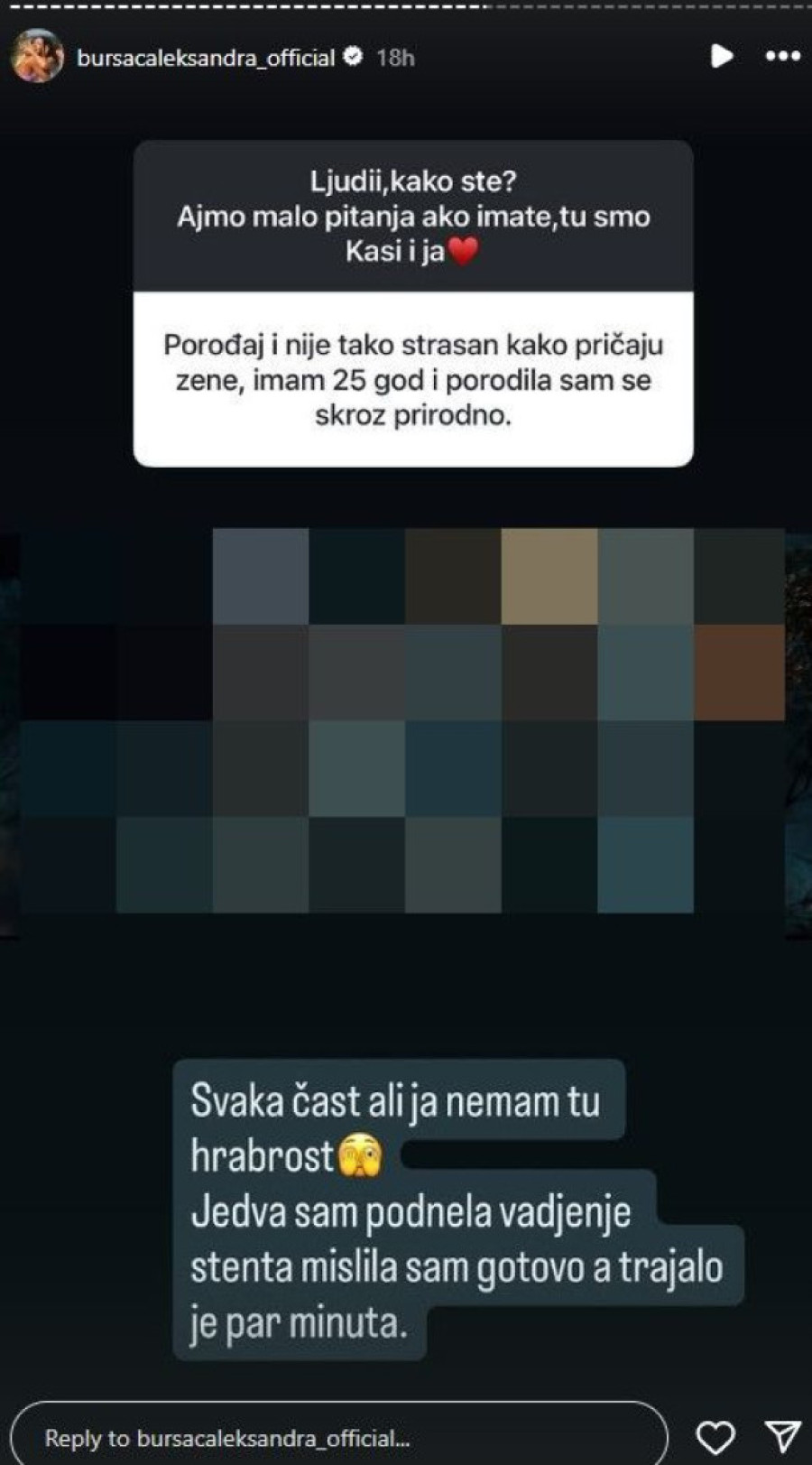 Jedna korisnica Instagrama je potom podelila svoje iskustvo sa porođaja, te je istakla da joj nije bilo toliko strašno, a pevačica se nadovezala: