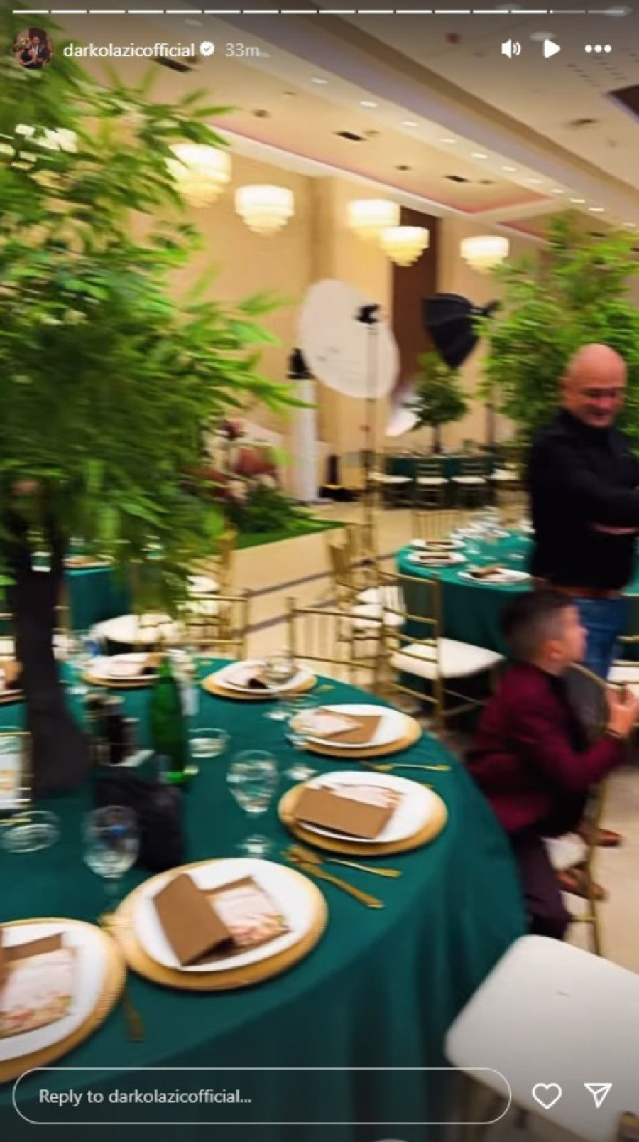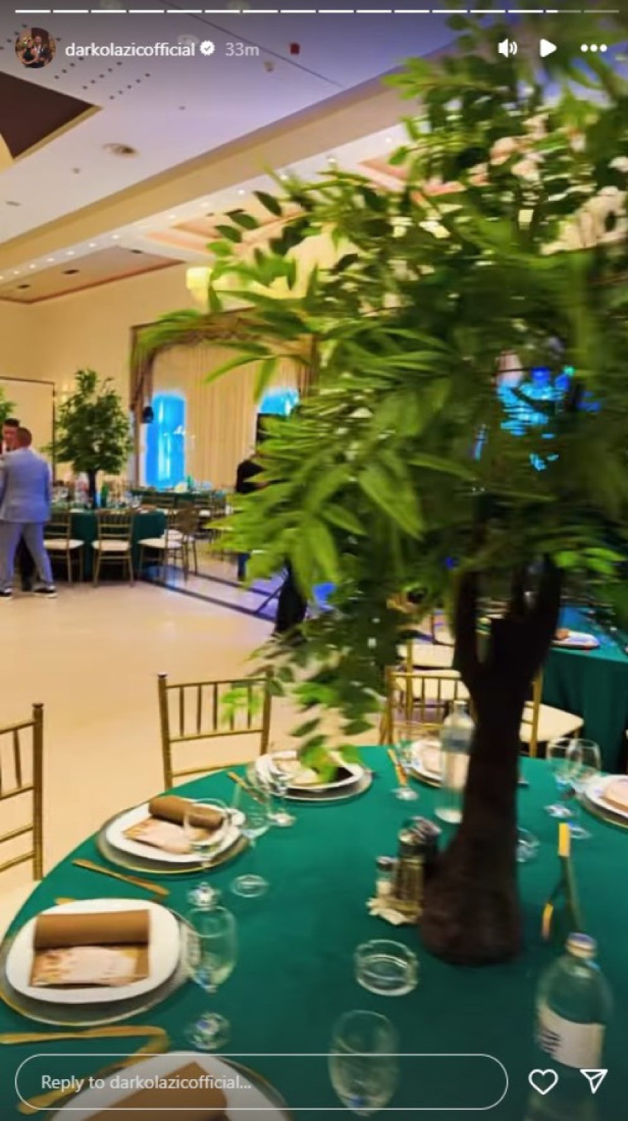 Stolovi su imali zelene stolnjake, dok je na njima stalo veštačko drvo.