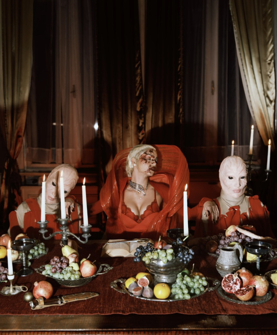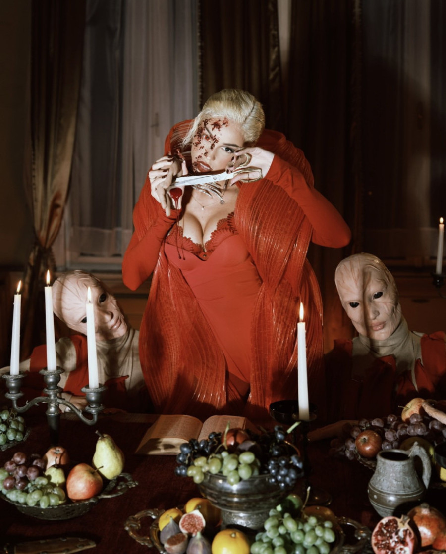 Umesto vampira, veštica ili popularnih filmskih likova, ona je izabrala arhetipsku figuru sudbine i smrti. U raskošnoj crvenoj haljini sa plisiranim detaljima i visokom kragnom, uz upečatljiv scenski mejkap i simboliku sveća i plodova na stolu, Breskvica je dočarala atmosferu rituala i moći.