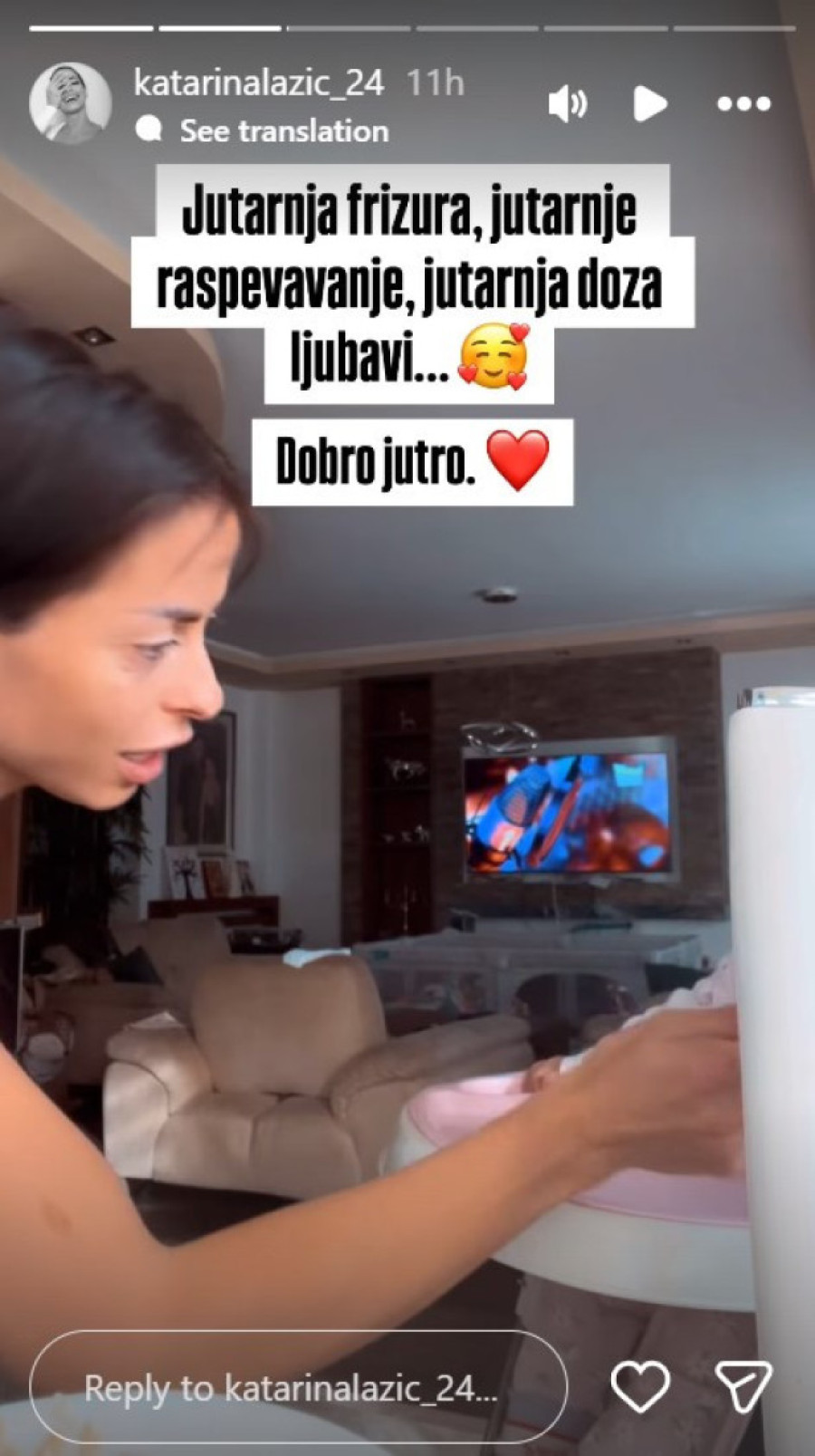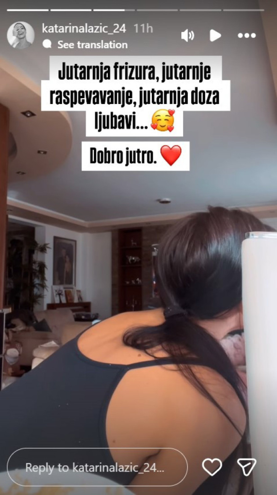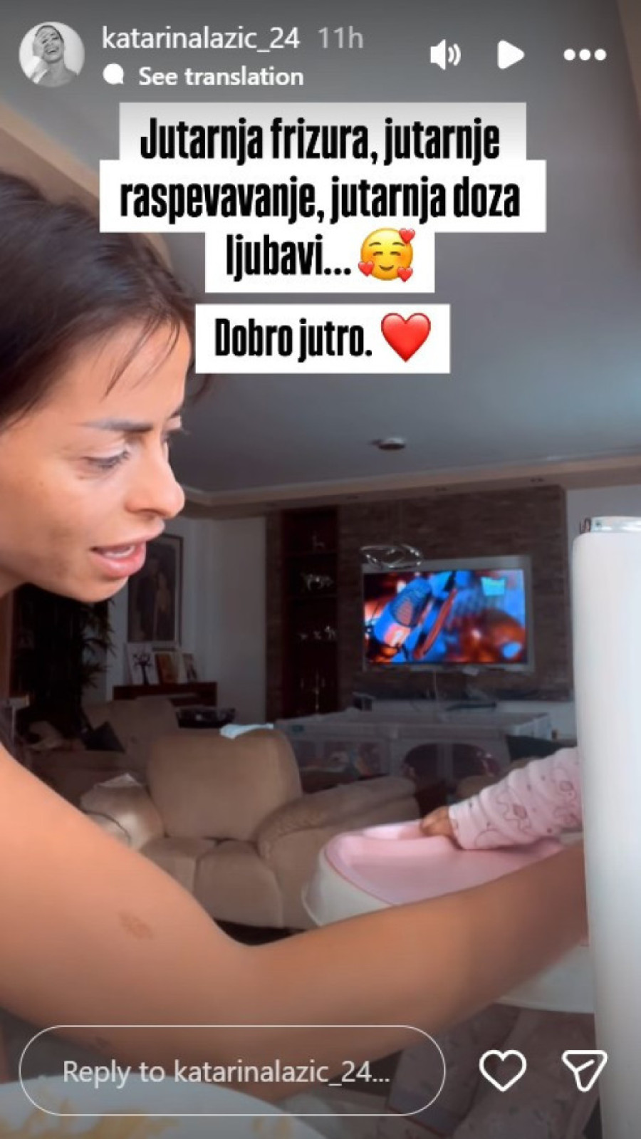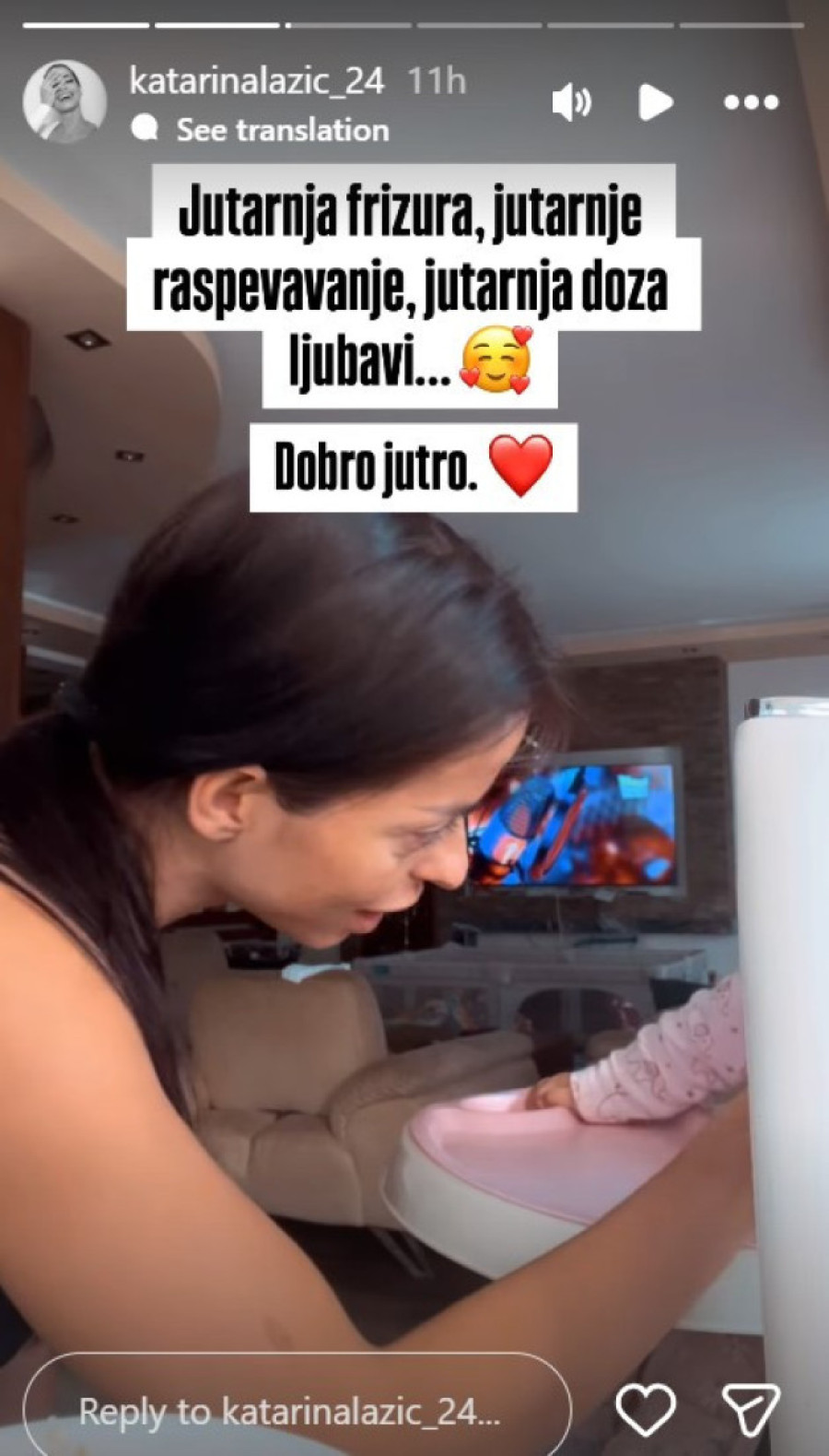 - Jutarnja frizura, jutarnje raspevavanje, jutarnja doza ljubavi. Dobro jutro - napisala je Kaća u videu na kom hrani i peva ćerkici Srni.