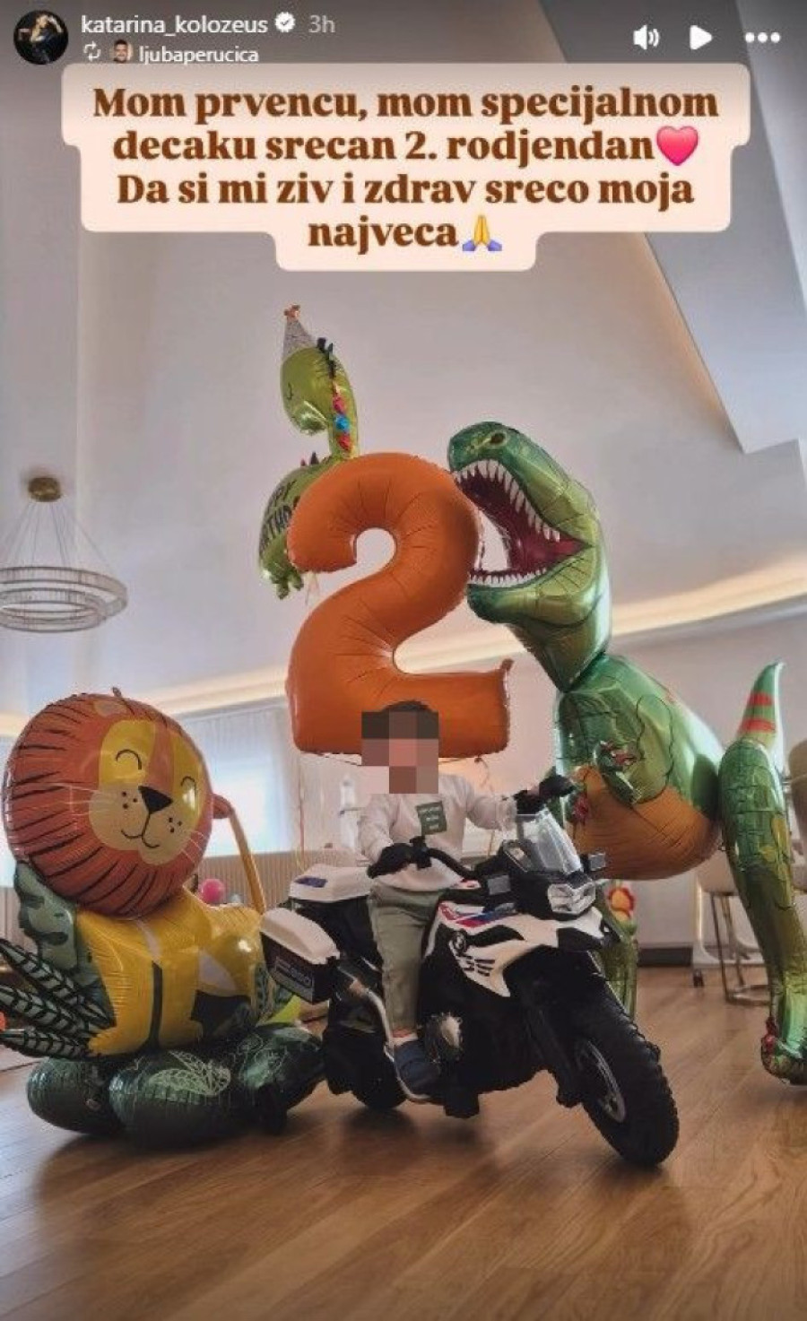 - Mom prvencu, mom specijalnom dečaku, srećan drugi rođendan. Da si mi živ i zdrav, srećo moja najveća - istakla je u okviru svojih "storija" pevačeva žena, uz fotografiju za koju je njen naslednik ispozirao na malom motoru za decu.