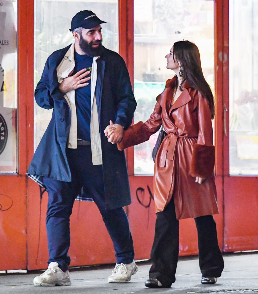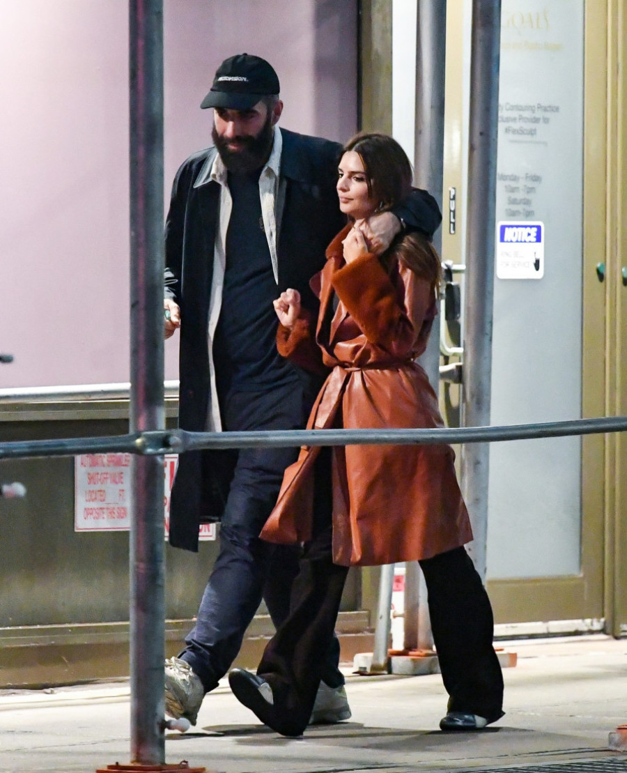 Za večernji izlazak, Emili je odabrala opuštenu, ali efektno stilizovanu kombinaciju: braon kožni mantil s krznenim rukavima, stegnut u struku, ispod kog je nosila crni top i široke crne pantalone. Izgled je upotpunila crno-belom obućom brenda Puma i velikim visećim minđušama. Romen je stilski savršeno ispratio svoju partnerku – nosio je tamnoplavi kaput preko bež košulje i plave majice, uz farmerke i crnu šiltericu.