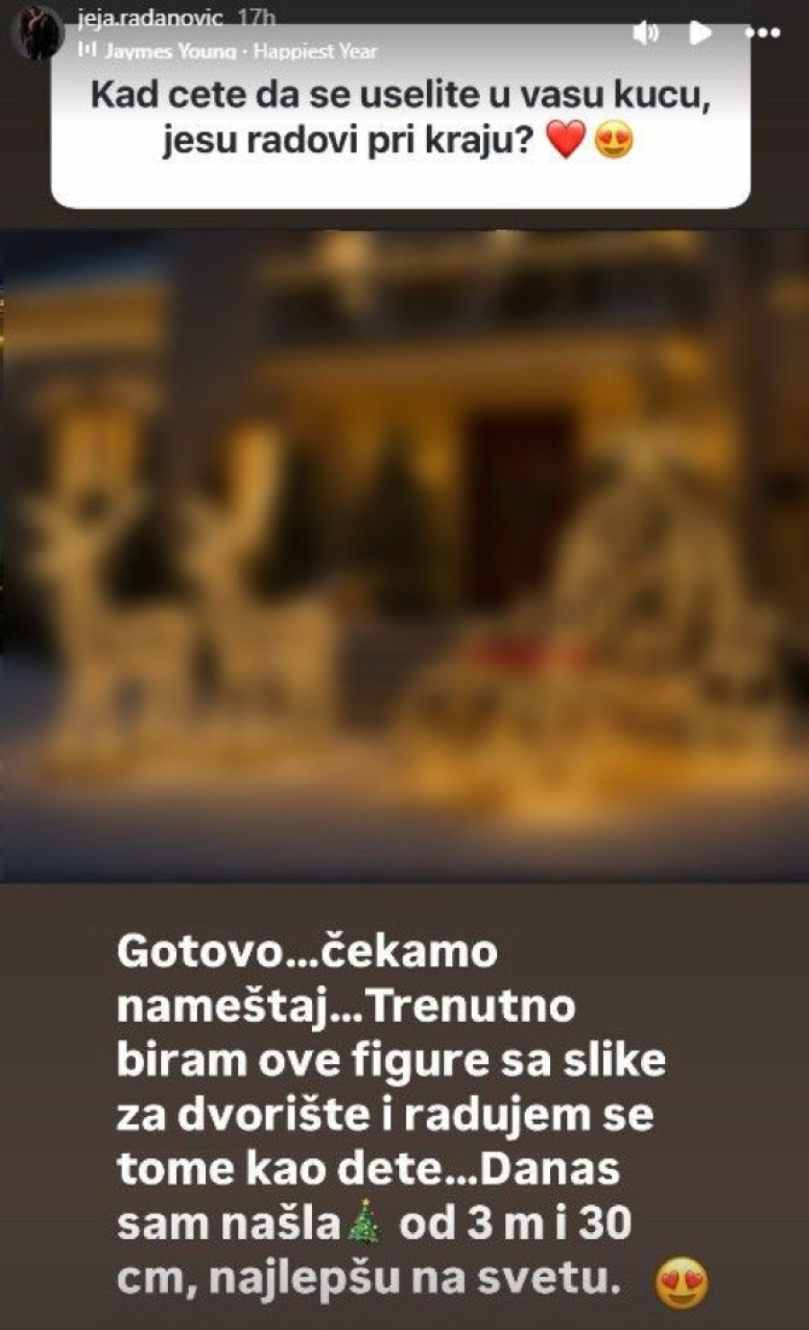 Trenutno, kako je Jelena Radanović istakla odgovarajući na pitanja fanova na Instagramu, čekaju nameštaj, a ona aktivno razmišlja i o novogodišnjoj dekoraciji.