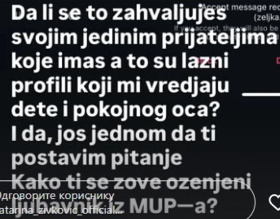 - Da li se to zahvaljuješ svojim pojedinim prijateljima koje imaš, a to su lažni profilu koji mi vređaju dete i pokojnog oca? I da, još jednom da ti postavim pitanje, kako ti se zove oženjeni ljubavnik iz MUP-a? - napisala je Kaća, ali se tu nije zaustavila.