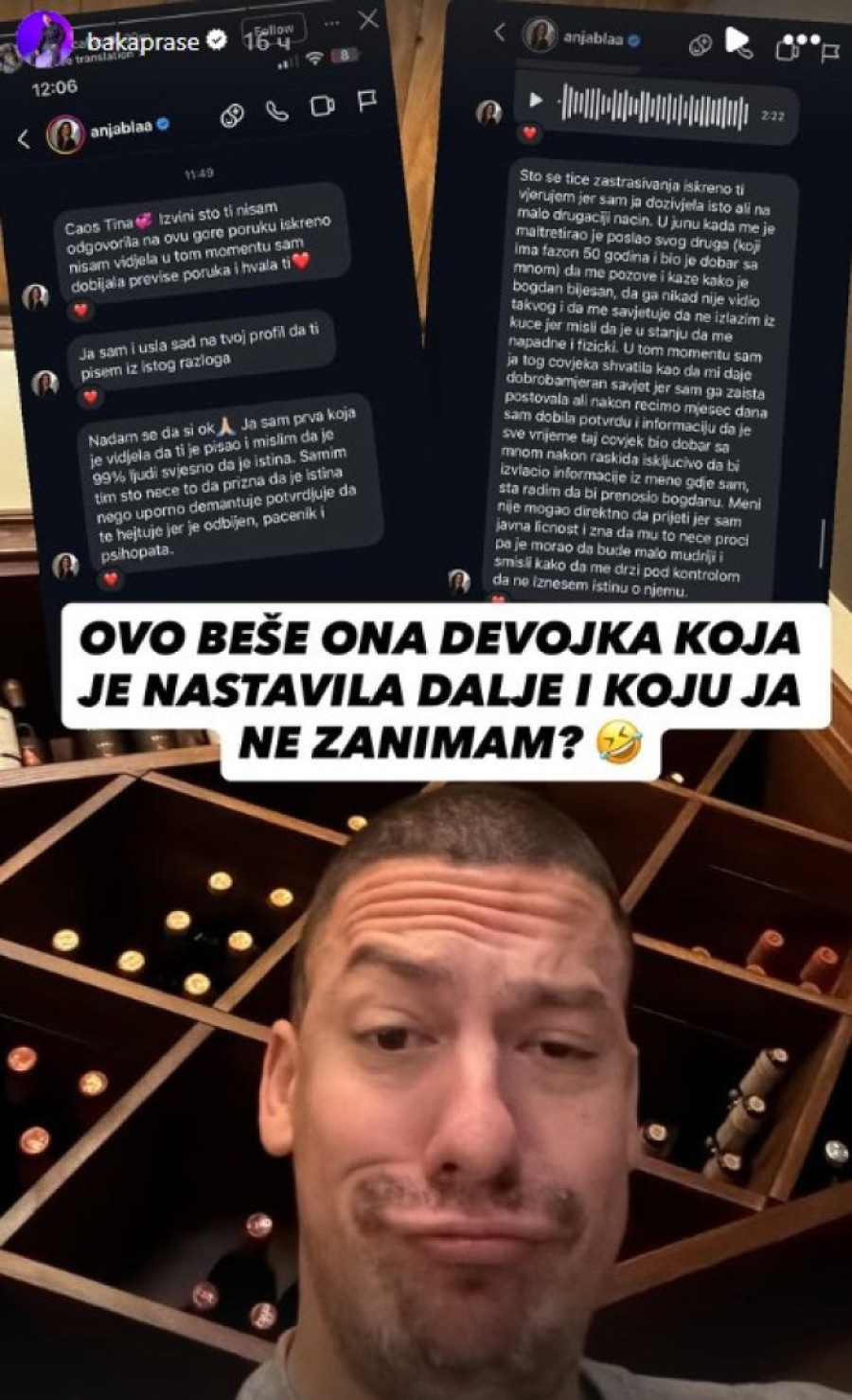Bogdan Ilić, koji se proslavio kao Baka Prase, pokazao je u poznatom stilu putem društvenih mreža kako je došao u posed izvesnih poruka koje je njegova bivša Anja Blagojević - Anja Bal naočigled slala "devojci sa kojom on ratuje". Anja je u okviru istih po svemu sudeći i te kako uperila prstom u Baku za zastrašivanje posle njihovog raskida, kao i korišćenja trećeg lica za prikupljanje informacija o njoj.