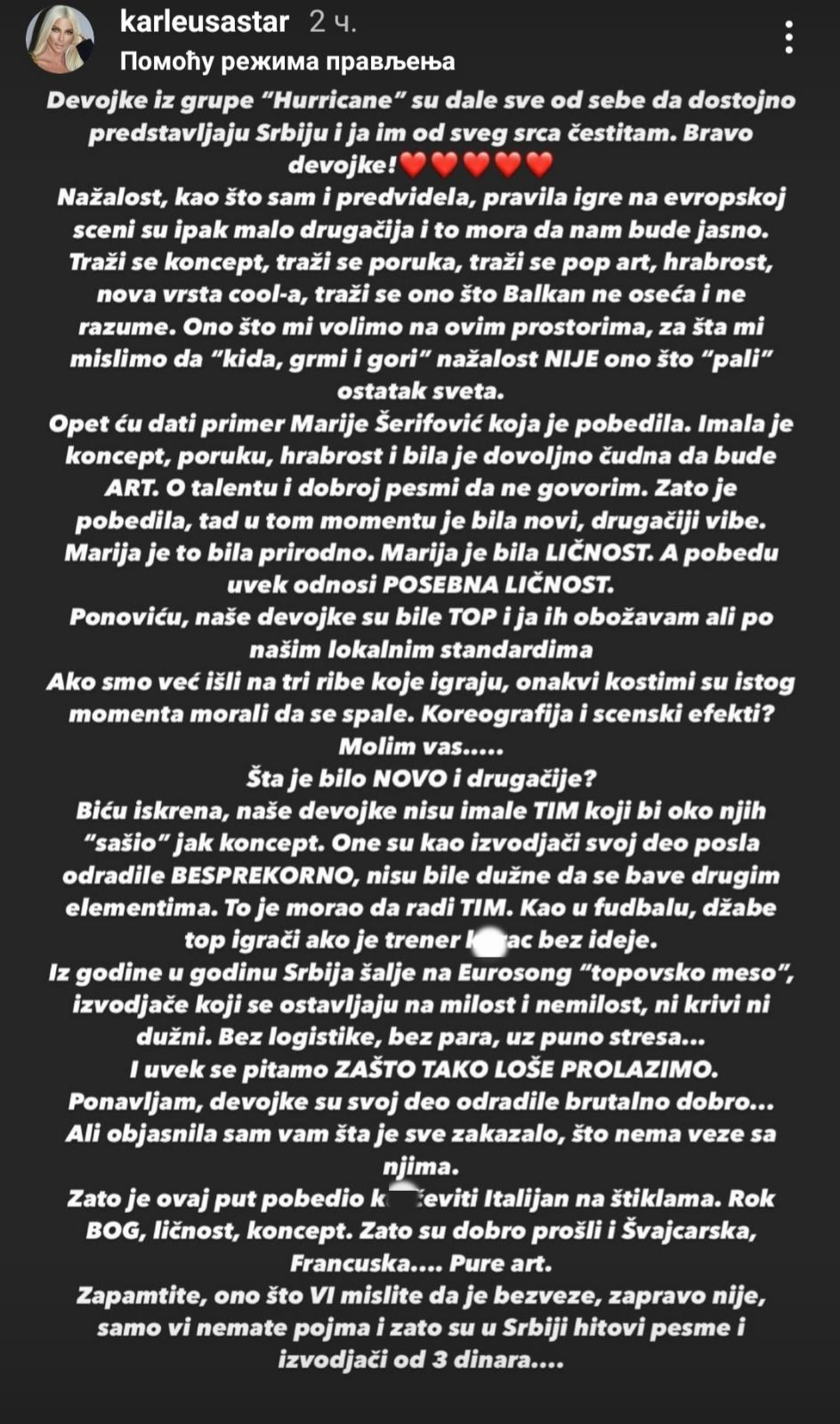 – Ponoviću, naše devojke su bile top i ja ih obožavam, ali po svim našim lokalnim standardima. Ako smo već išli na tri ribe koje igraju, onakvi kostimi su istog momenta morali da se spale. Koreografija i scenski efekti? Molim vas… Šta je bilo novo i drugačije? Biću iskrena, naše devojke nisu imale tim koji bi oko njih „sašio” jak koncept. One su kao izvođači svoj deo posla odradile besprekorno, nisu bile dužne da se bave drugim elementima. To je morao da radi tim. Kao u fudbalu, džaba top igrači ako je trener ku*ac bez ideje. Iz godine u godinu Srbija šalje na Eurosong „topovsko meso”, izvođače koji se ostavljaju na milost i nemilost, ni krivi ni dužni. Bez logistike, bez para, uz puno stresa… I uvek se pitamo zašto loše prolazimo. Ponavljam, devojke su svoj posao odradile brutalno dobro… Ali objasnila sam vam šta je sve zakazalo, što nema veze sa njima. Zato je ovaj put pobedio ku**eviti Italijan na štiklama. Rok bog, ličnost, koncept. Zato su dobro prošli i Švajcarska, Francuska… Pure art. Zapamtite, ono što vi mislite da je bezveze, zapravo nije, samo vi nemate pojma i zato su u Srbiji hitovi, pesme i izvođači od 3 dinara… – napisala je Karleuša u svom obraćanju na Instagramu.