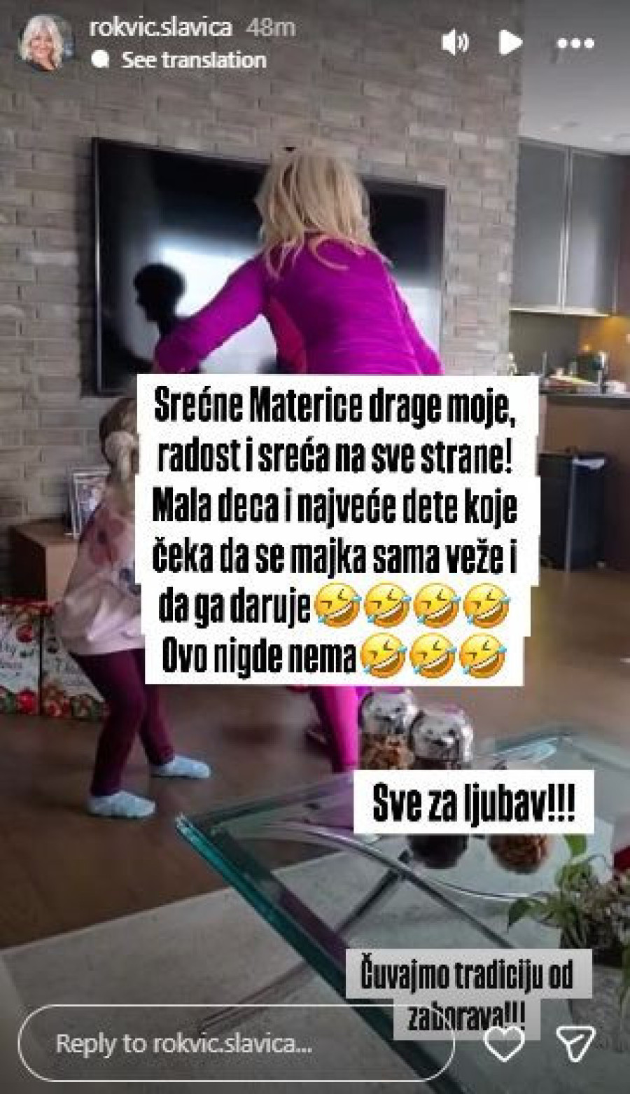 - Srećne Materice, drage moje, radost i sreća na sve strane. Mala deca i najveće dete koje čeka da se majka sama veže i da ga daruje. Ovo nigde nema - potpisala je ona taj video onlajn.
