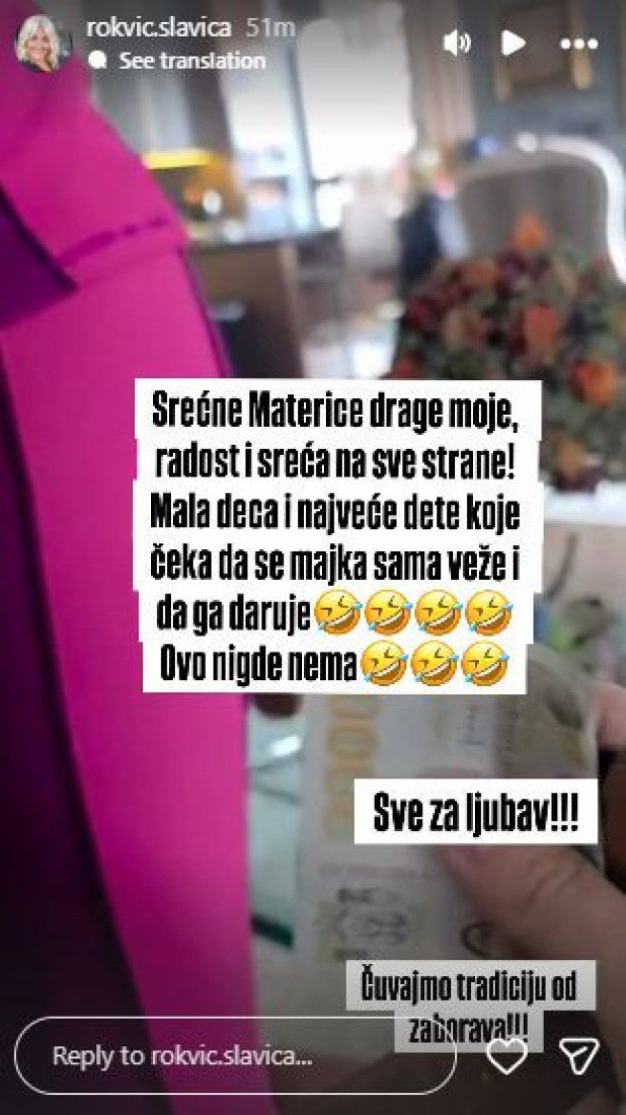 - Sve za ljubav. Čuvajmo tradiciju od zaborava - dodala je potom Slavica, pa zasigurno izmamila i razne reakcije svojih fanova.