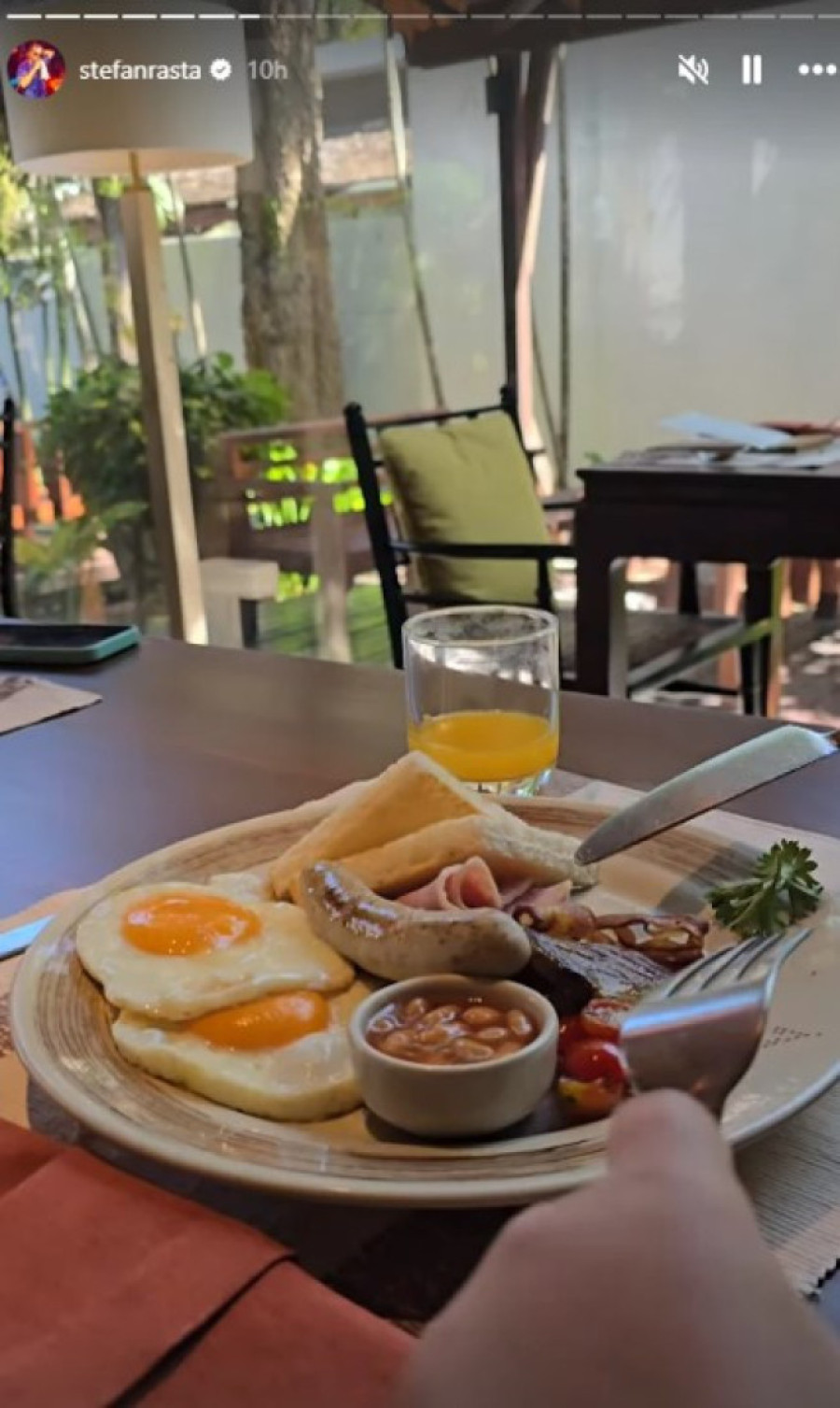 Na stolu se našao bogat i pažljivo složen obrok – jaja na oko, kobasice, hrskava slanina, kriške šunke, kao i pečurke i pasulj u maloj činijici. Uz sve to, servirani su i tostirani hleb i čaša sveže ceđenog soka od pomorandže.