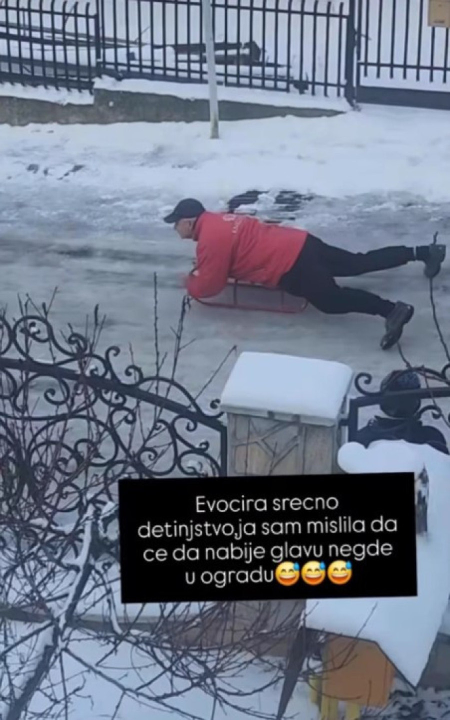 U jednom trenutku on je legao na dečje sanke i spustio se niz zaleđenu ulicu, dok je Jasmina kroz smeh komentarisala: