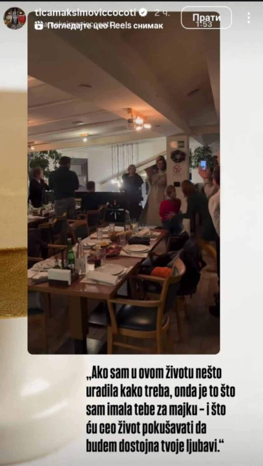- Srećan 60. rođendan, mama. Šezdeset godina ljubavi, snage i dobrote. Šezdeset godina u kojima si bila oslonac, dom i sigurnost svima nama. Ti si oličenje poštenja, istine i čiste duše, žena koja je uvek išla uspravno, makar joj bilo najteže. Zbog toga smo beskrajno ponosni na tebe. U tvojim rukama smo naučili šta znači ljubav bez uslova, u tvom zagrljaju šta znači mir, a iz tvog primera kako se postaje dobar i ispravan čovek. Hvala ti za svaku neprospavanu noć, za svaku brigu koju si ćutke nosila, za svaki osmeh koji si davala čak i onda kada te je bolelo. Mama, želim i da ti se izvinim za sve trenutke u kojima sam te kroz život možda povredila, razočarala ili ti otežala put. Veruj mi da je sve to bilo deo mog rasta, i obećavam ti da ću do kraja života živeti tako da budeš ponosna na mene - onako kako sam ja danas ponosna na tebe. Ako danas slavimo tvoj rođendan, mi zapravo slavimo ženu zbog koje smo to što jesmo. Želimo ti zdravlje, mir u srcu i dane u kojima ćeš konačno misliti više na sebe, jer si ceo život mislila na nas. Volimo te više nego što reči mogu da kažu. Zauvek - napisala je ona.