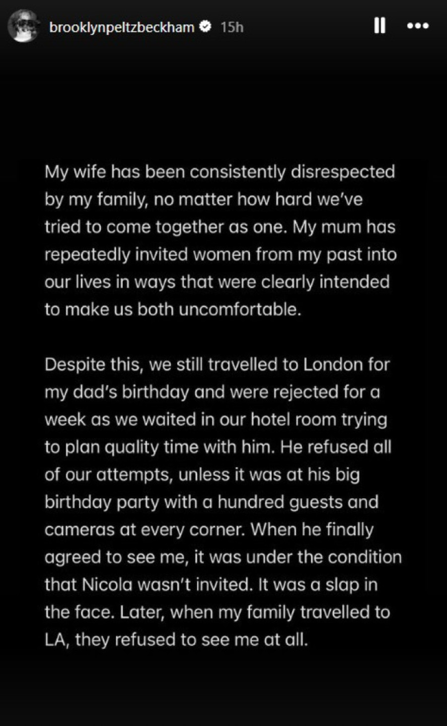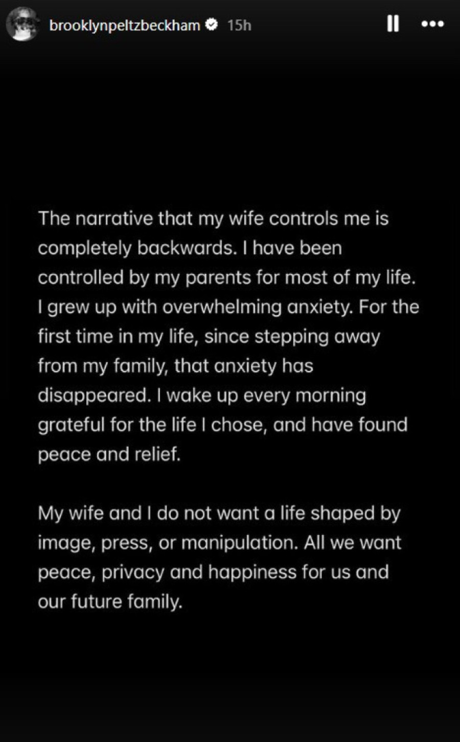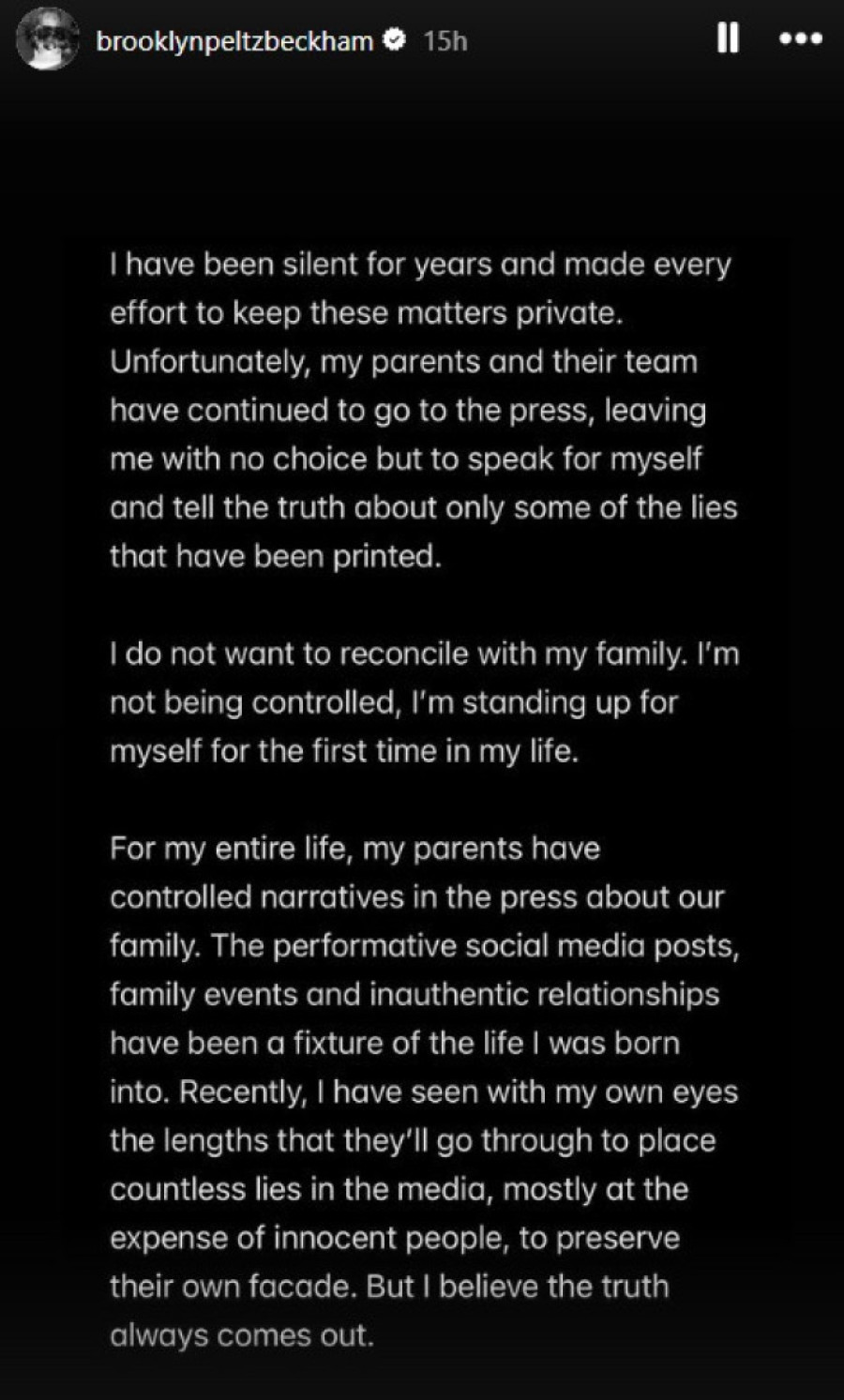 - Sve što želimo su mir, privatnost i sreća za nas i našu buduću porodicu - napisao je, između ostalog, Bruklin, zaključujući dugu listu optužbi na račun svoje "performativne i kontrolišuće" majke, pa i oca Dejvida.