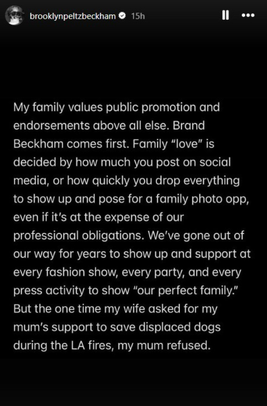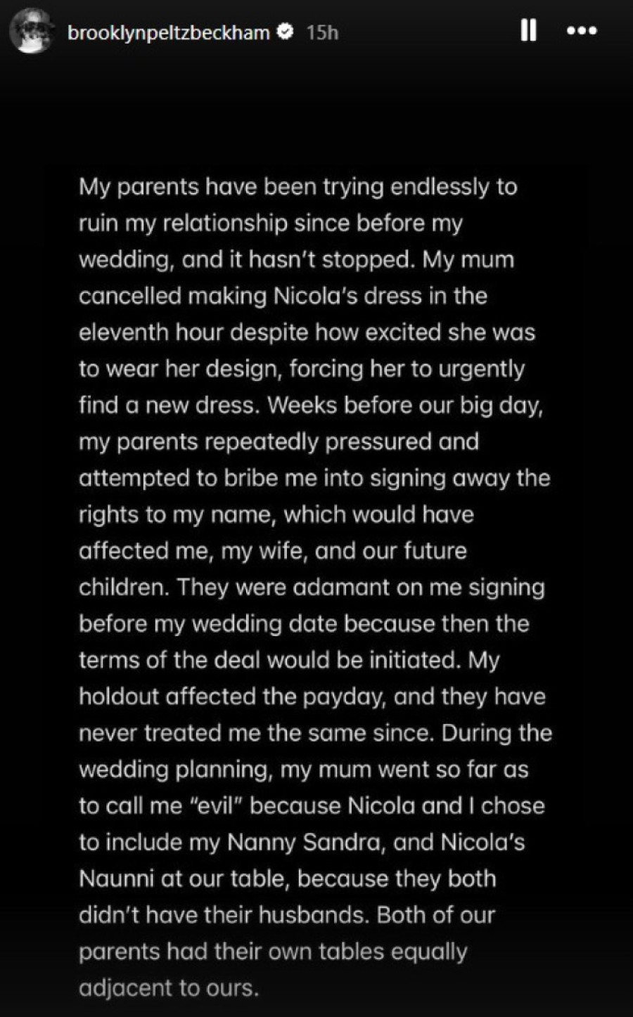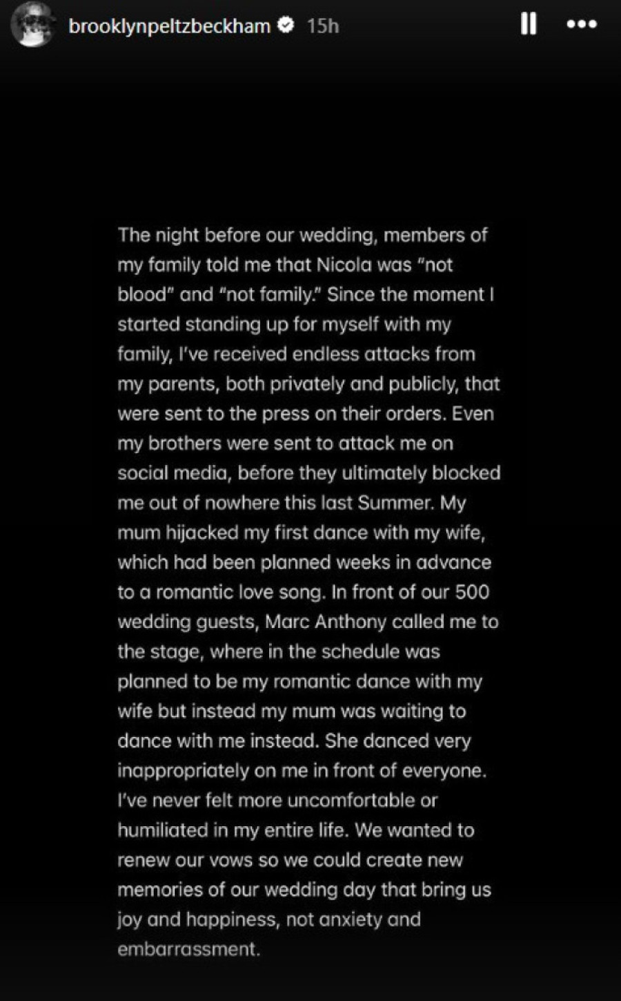 - Sve što želimo su mir, privatnost i sreća za nas i našu buduću porodicu - napisao je, između ostalog, Bruklin, zaključujući dugu listu optužbi na račun svoje "performativne i kontrolišuće" majke, pa i oca Dejvida.