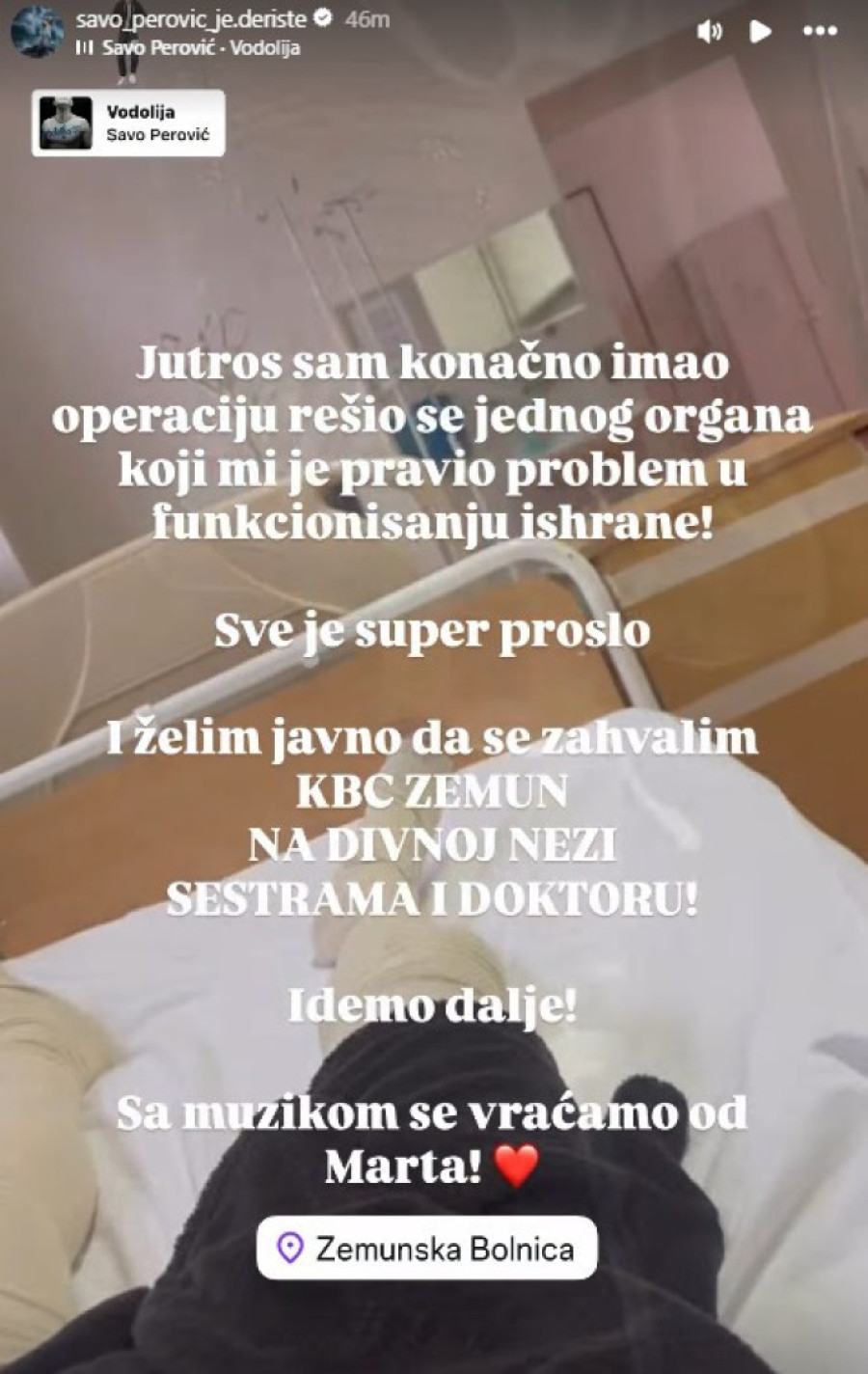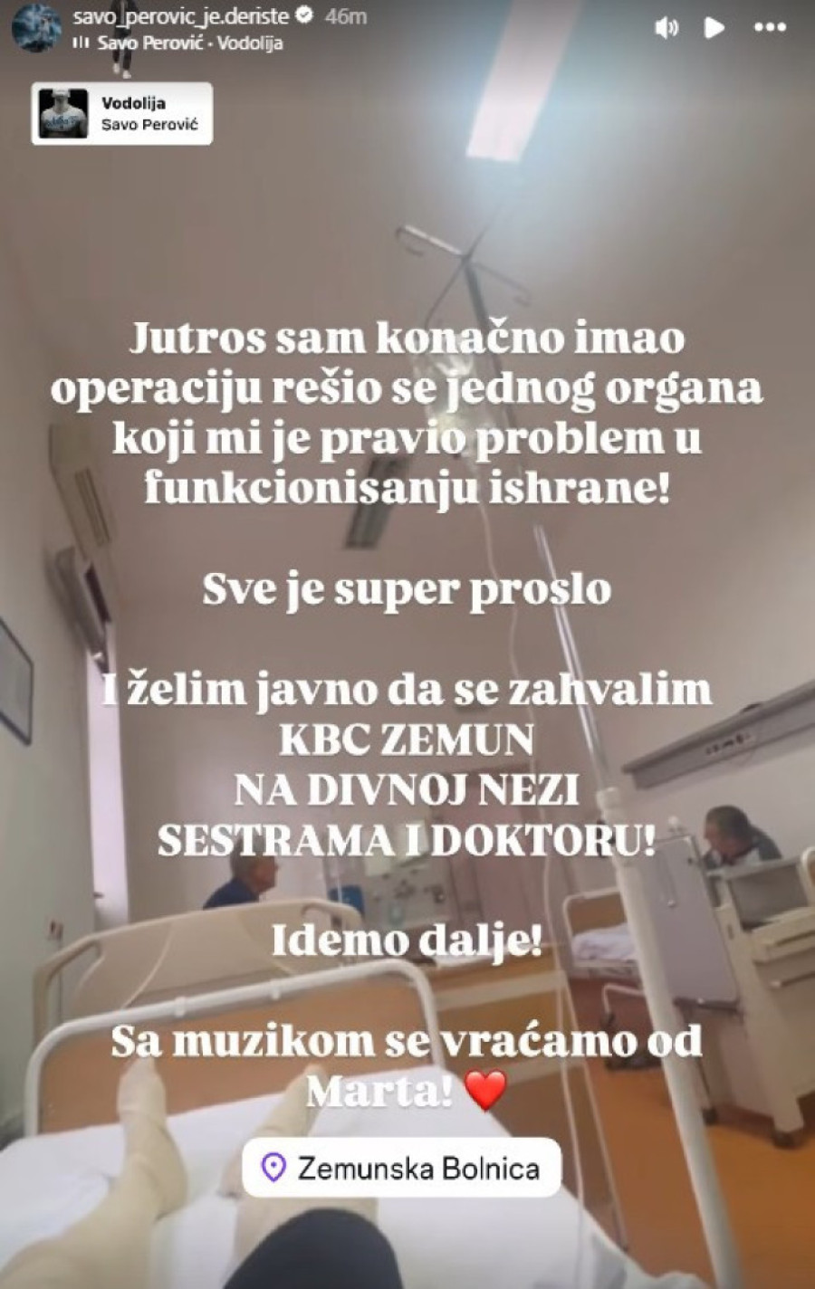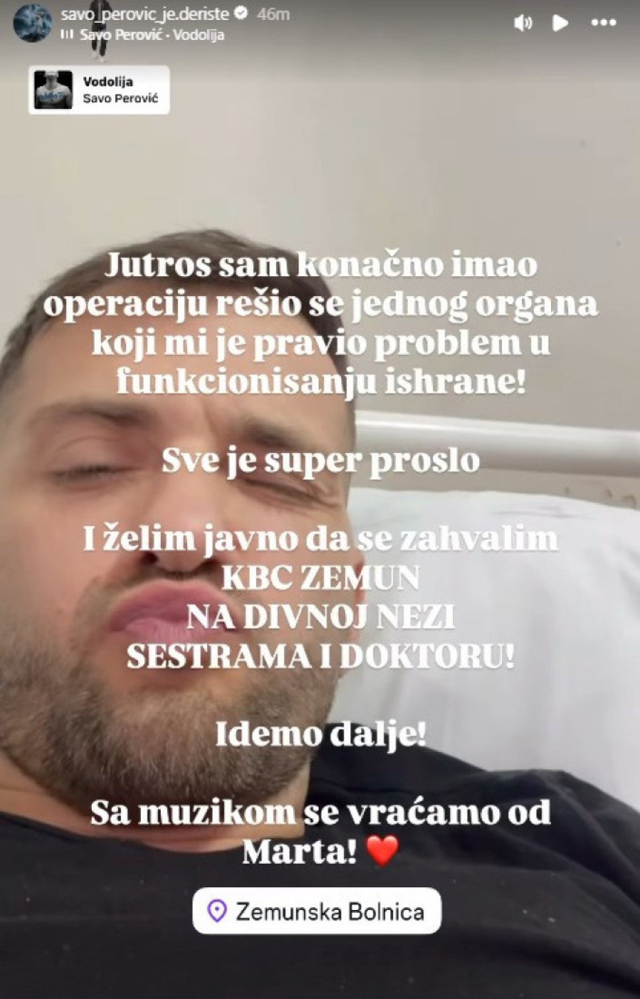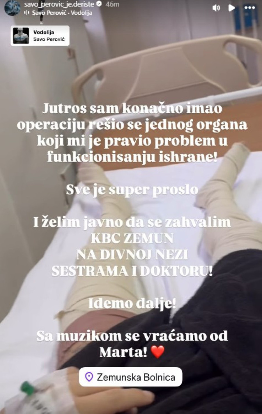 Pevač i nekadašnji zadrugar Savo Perović oglasio se iz bolničke postelje, te poručio da je jutros imao jednu operaciju. Istom je, prema sopstvenom priznanju, prilično zadovoljan.