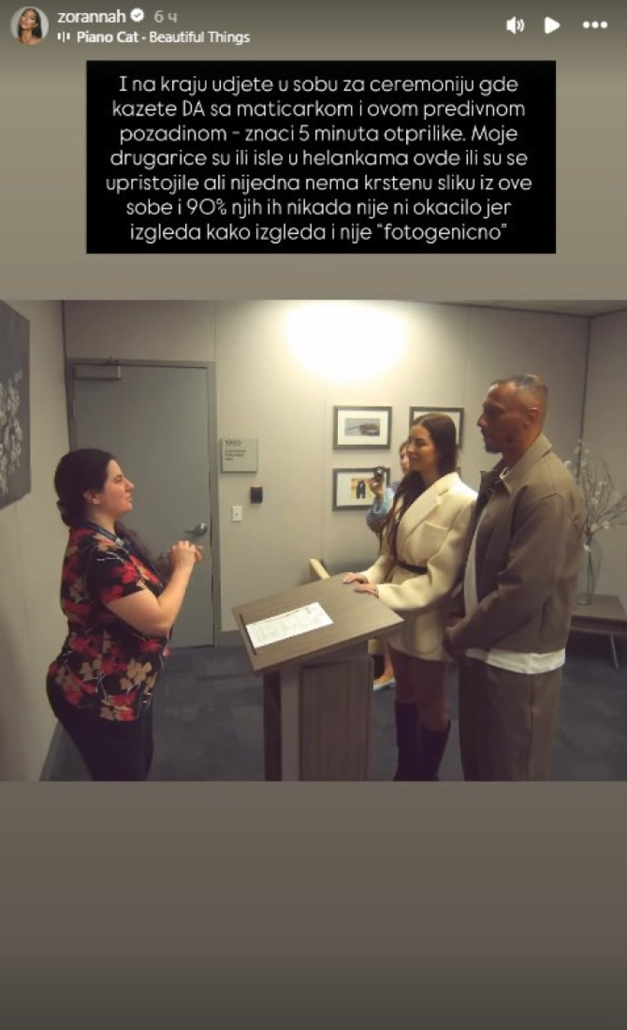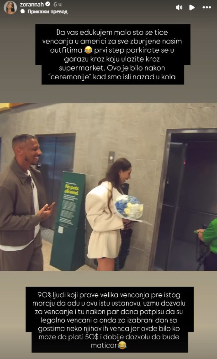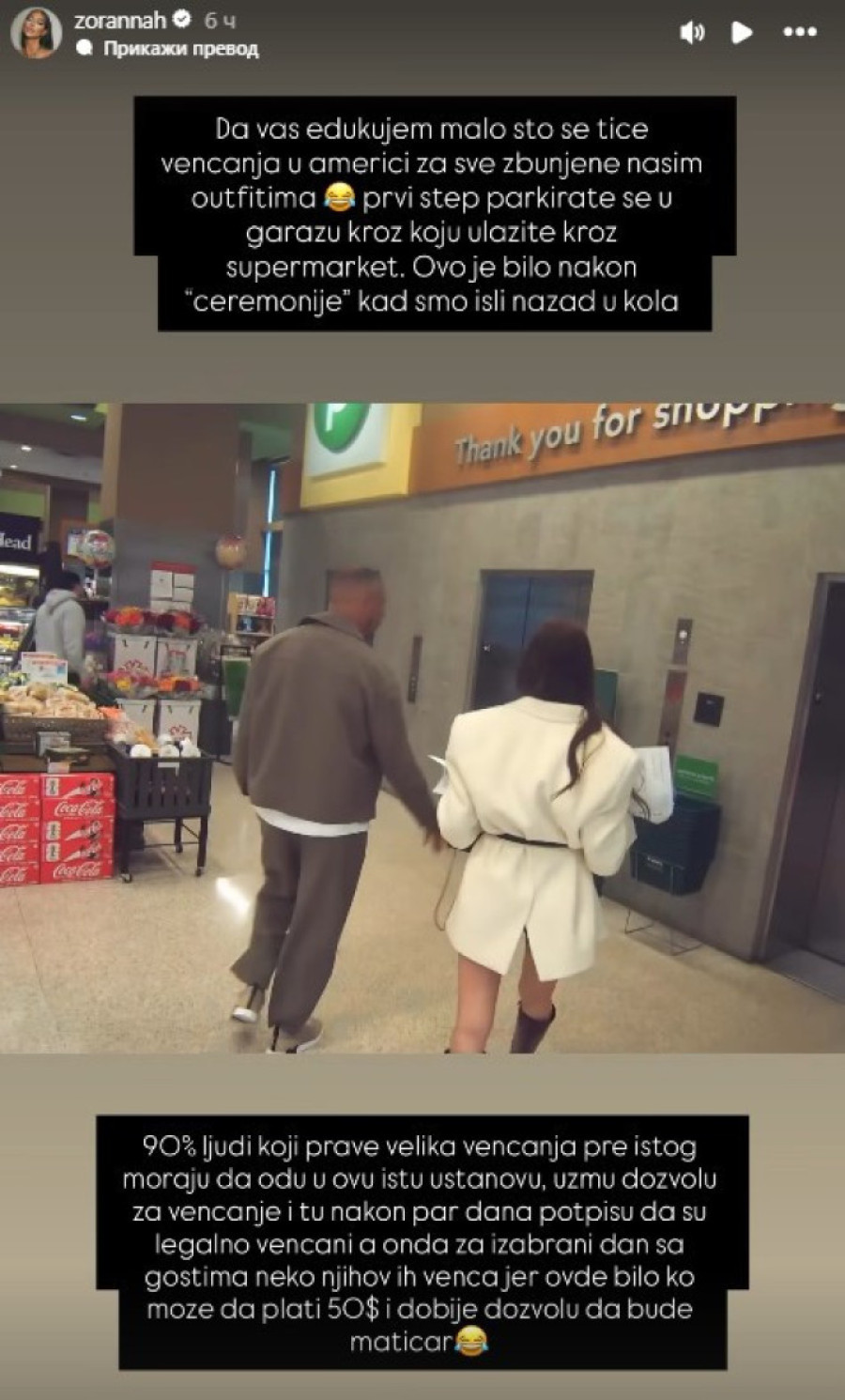 - Da vas malo edukujem, što se tiče venčanja u Americi, za sve zbunjene našim autfitima. Prvi korak je parkiranje u garažu, kroz koju ulazite kroz supermarket. Ovo je bilo nakon "ceremonije", kada smo išli nazad u kola. Devedeset odsto ljudi koji prave velika venčanja pre istog moraju da odu u ovu istu ustanovu, uzmu dozvolu za venčanje i tu, nakon par dana, potpišu da su legalno venčani, a onda, za izabrani dan sa gostima, neko njihov ih venča, jer ovde bilo ko može da plati 50 dolara i dobije dozvolu da bude matičar - počela je ona u okviru svojih "storija".