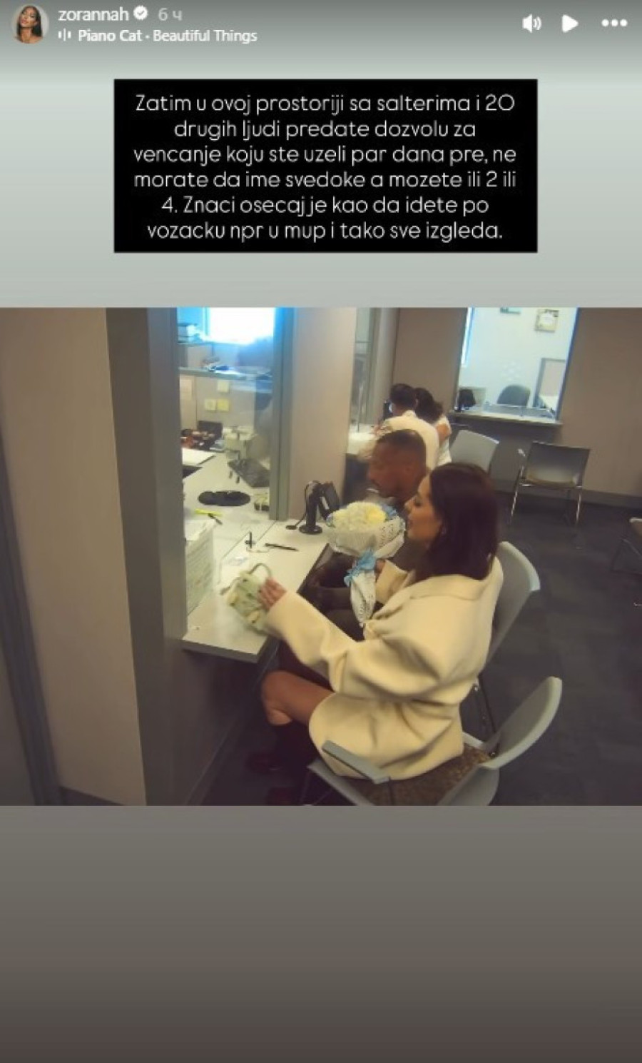 - Zatim, u ovoj prostoriji sa šalterima i 20 drugih ljudi predate dozvolu za venčanje koju ste uzeli par dana pre, ne morate da imate svedoke, a možete ili dva ili četiri. Znači, osećaj je kao da idete po vozačku na primer u MUP i tako sve izgleda - dodala je potom, a kako je tačno sve to izgledalo možete pogledati i u galeriji koja sledi.