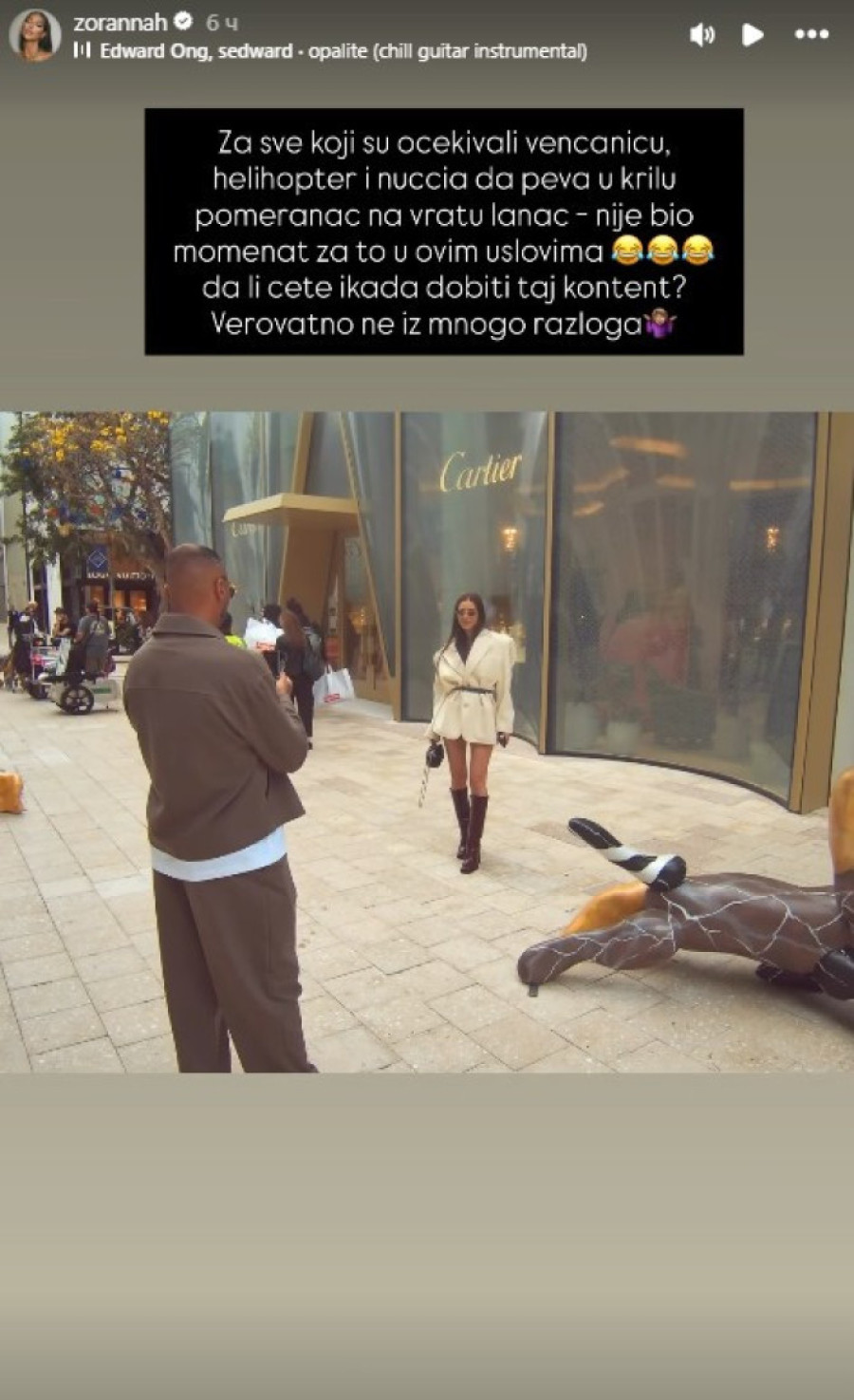 - Za sve koji su očekivali venčanicu, helihopter i Nućija da peva "u krilu pomeranac, na vratu lanac", nije bio momenat za to u ovim uslovima. Da li ćete ikada dobiti taj kontent? Verovatno ne, iz mnogo razloga - zaključila je Zorannah.