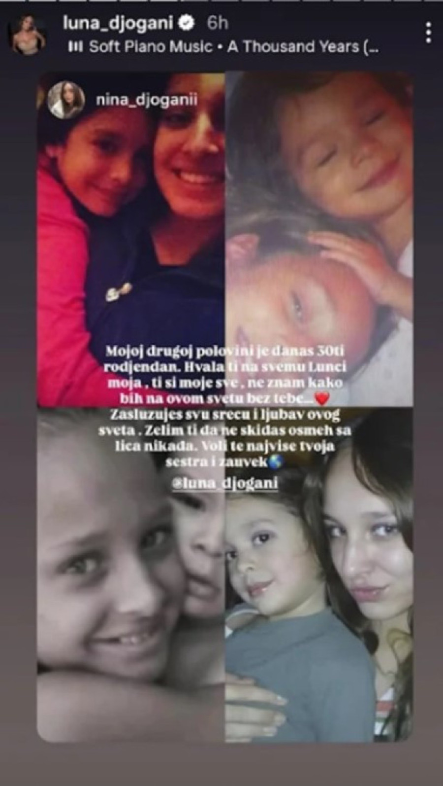 - Mojoj drugoj polovini je danas 30. rođendan. Hvala ti na svemu Lunči moja, ti si moje sve, ne znam kako bih na ovom svetu bez tebe. Zaslužuješ svu sreću i ljubav ovog sveta. Želim ti da ne skidaš osmeh sa lica nikada. Voli te najviše tvoja sestra - poručila je Nina Đogani.