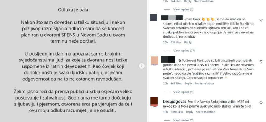 - Pala je odluka srpskog naroda… Da Toni Cetinski više nikada ne zapeva u našoj Srbiji. Nadam se da će to razumeti i poštovati - napisala je jedna korisnica Instagrama ispod Tonijeve objave, dok su se nizali i ostali komentari da ovde nije poželjan više.