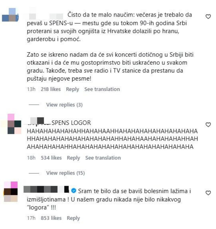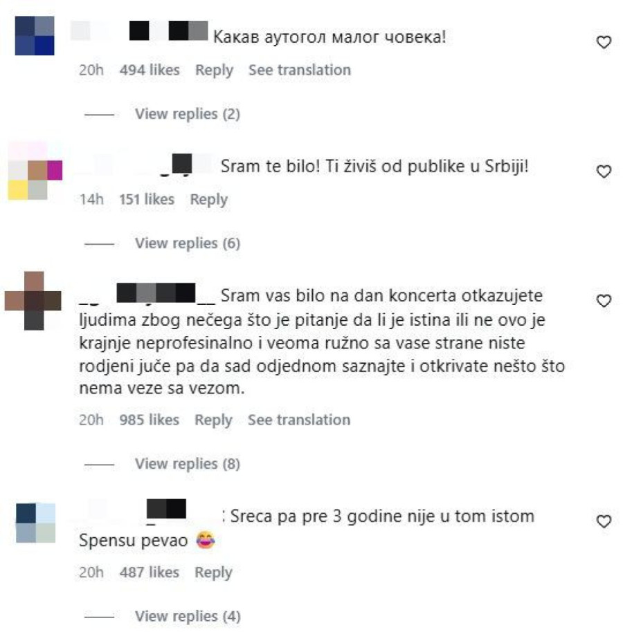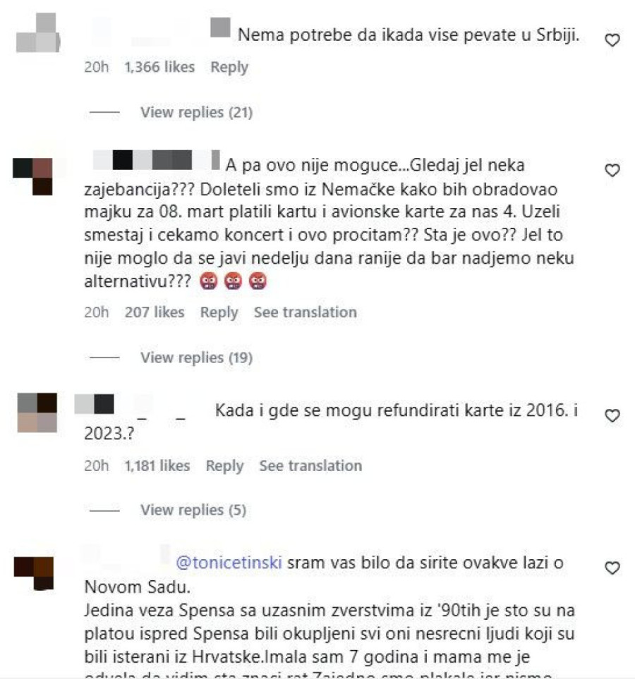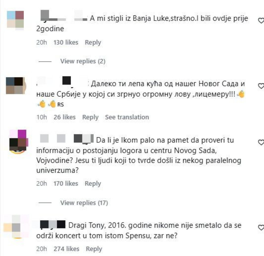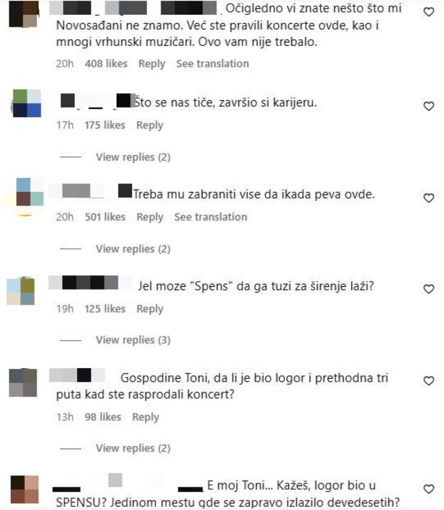 Ispod njegovog skandaloznog obaveštenja na Instagramu oglasili su se Tonijevi obožavaoci, mahom oni koji su mu poručili da na njegov koncert više nikada neće doći. Argumenti su opravdani, složili su se u komentarima, jer osim što je pevao upravo u Spensu više puta, podlegao je lažima. I to teškim lažima, zbog kojih ne samo da ga više ne žele Novosađani, nego u čitavoj Srbiji. Mnogi su u obraćanju Cetinskom izneli svoj šok i razočaranje.