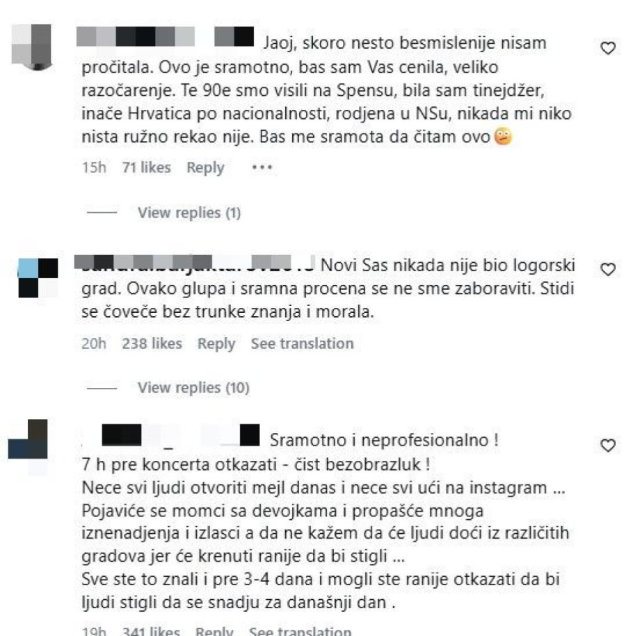 Manji deo opširnih komentara njegove bivše publike povodom odluke da otkaže koncert u "minut do 12", možete pogledati u galeriji iznad, a ono čemu se svi nadaju, jeste da Cetinski ne samo da ne treba da peva više u Novom Sadu, već na teriorotiji cele Srbije.