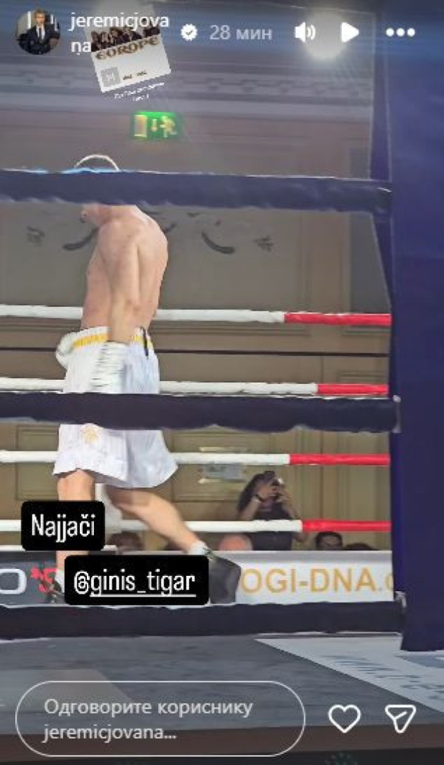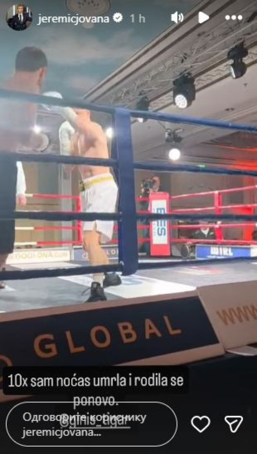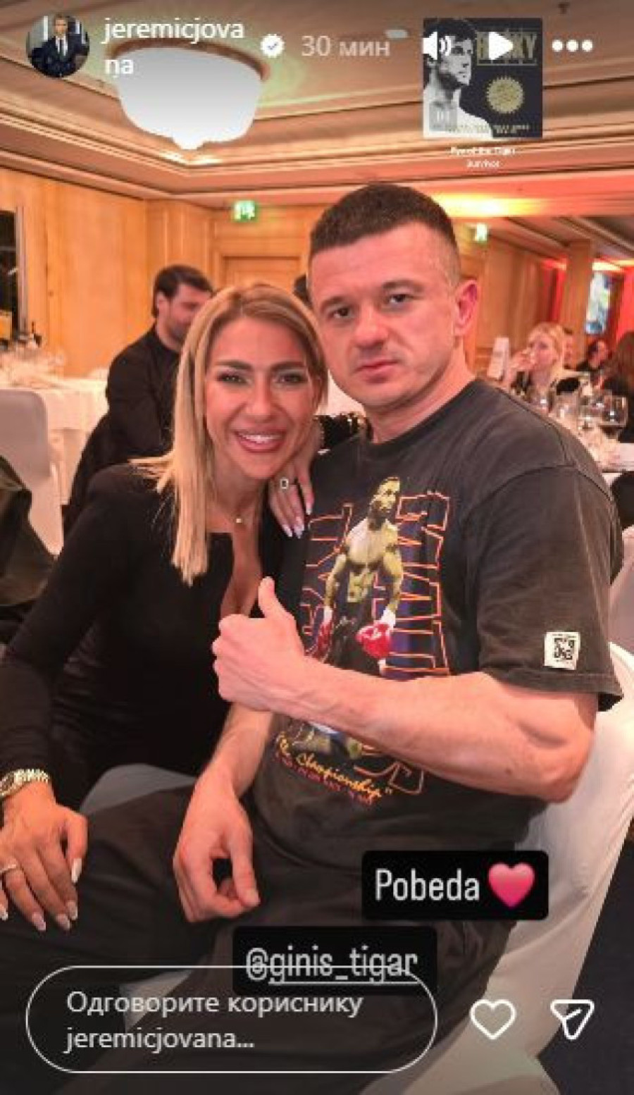 Nakon trijumfa Miloša Stojanovića Tigra, voditeljka Jovana Jeremić - koja je otputovala u Beč ne bi li ga bodrila tokom meča - oglasila se na društvenim mrežama, te istakla koliko je ponosna na svog izabranika.