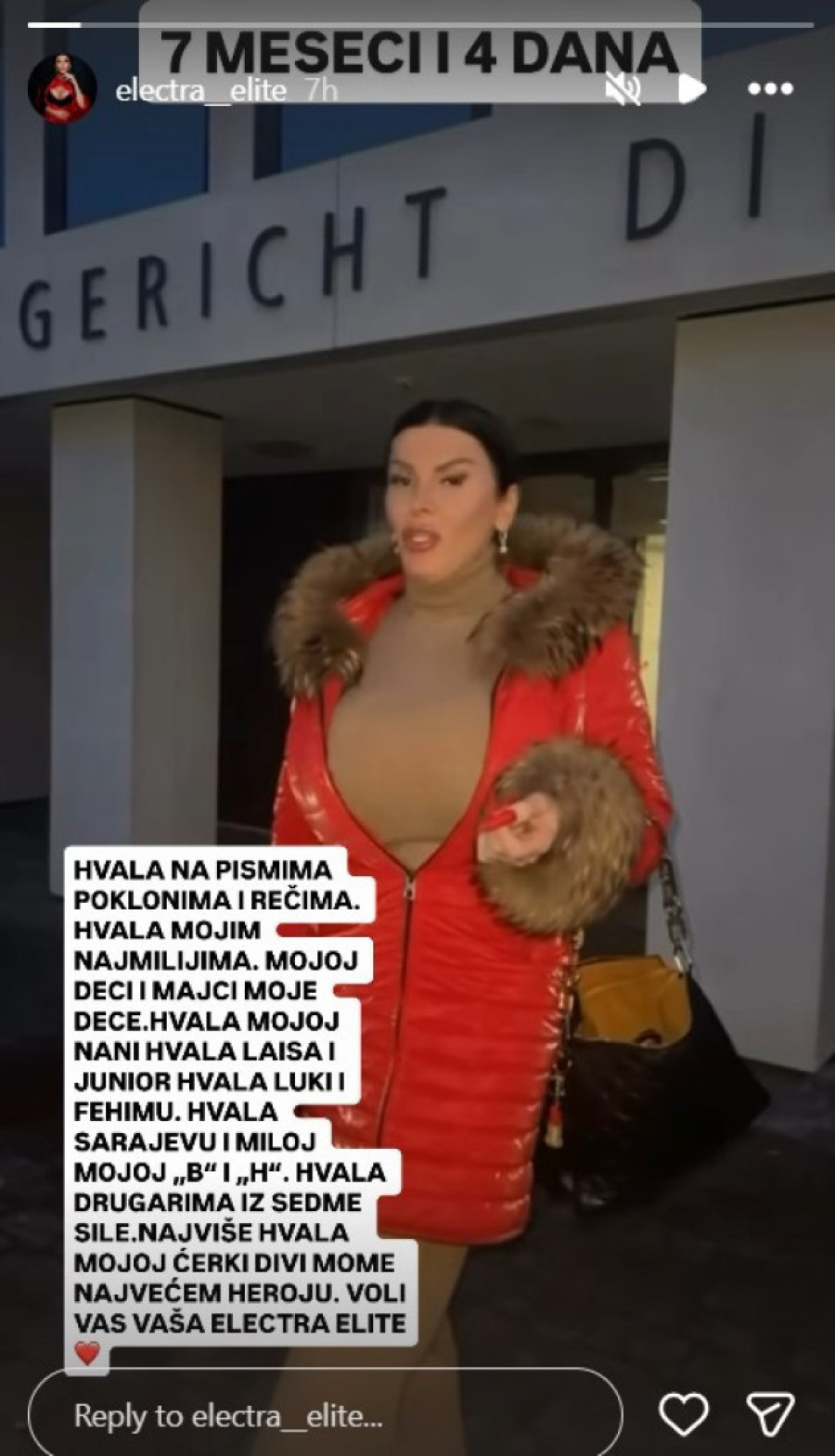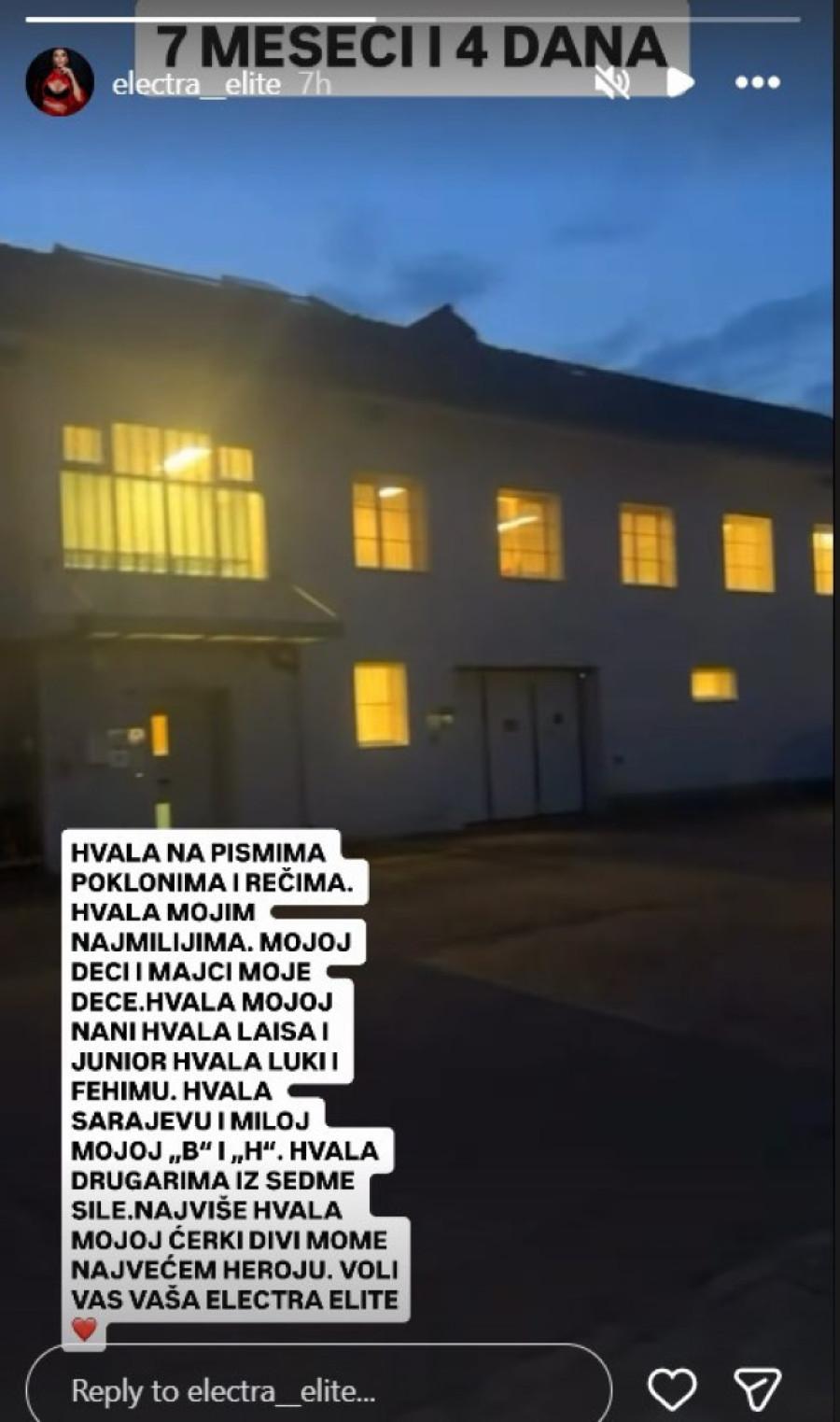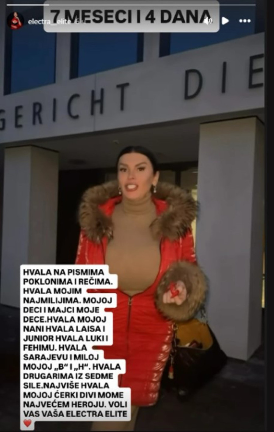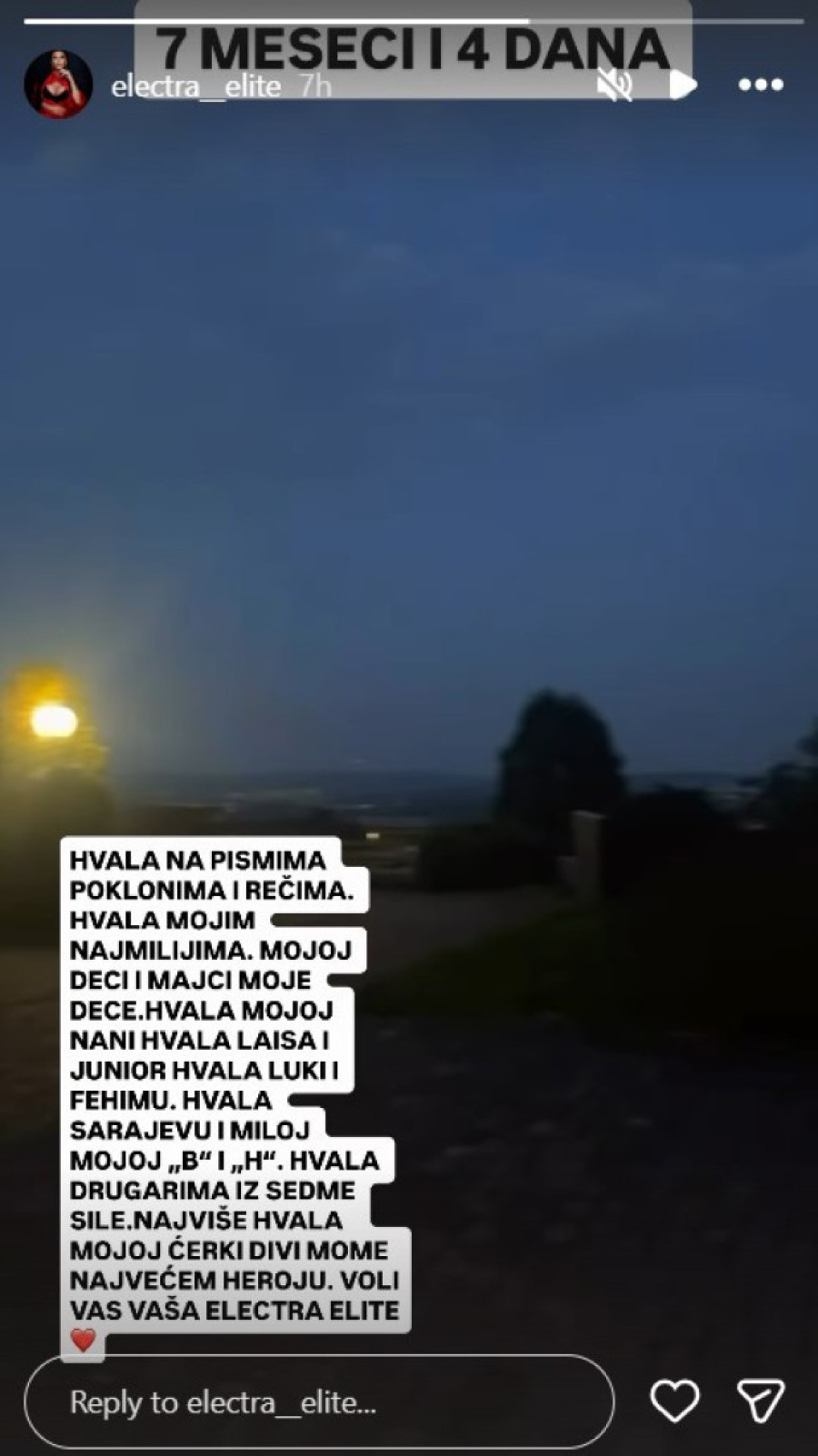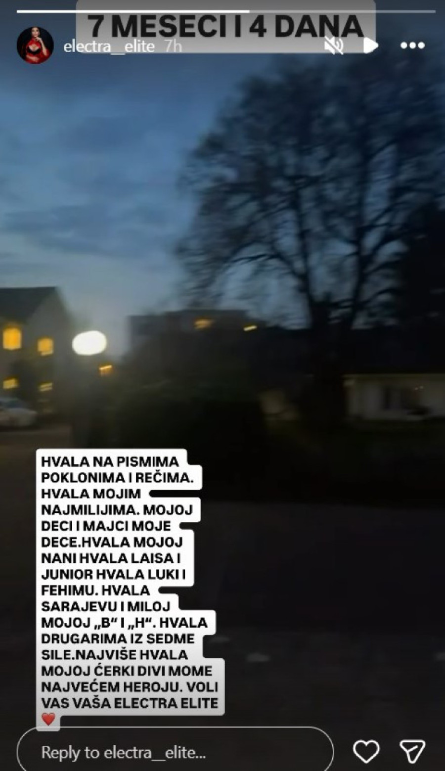 - Hvala svima na pismima, polonima i rečima. Hvala mojim najmilijima, mojoj deci i majci moje dece. Hvala mojoj Hani, hvala Laisi i Junioru. Hvala Luki i Fehimu. Hvala Sarajevu i miloj mojoj "B" i "H". Hvala drugarima iz sedme sile. Najviše hvala mojoj ćerki Divi, mome najvećem heroju. Voli vaš vaša Elektra Elit.