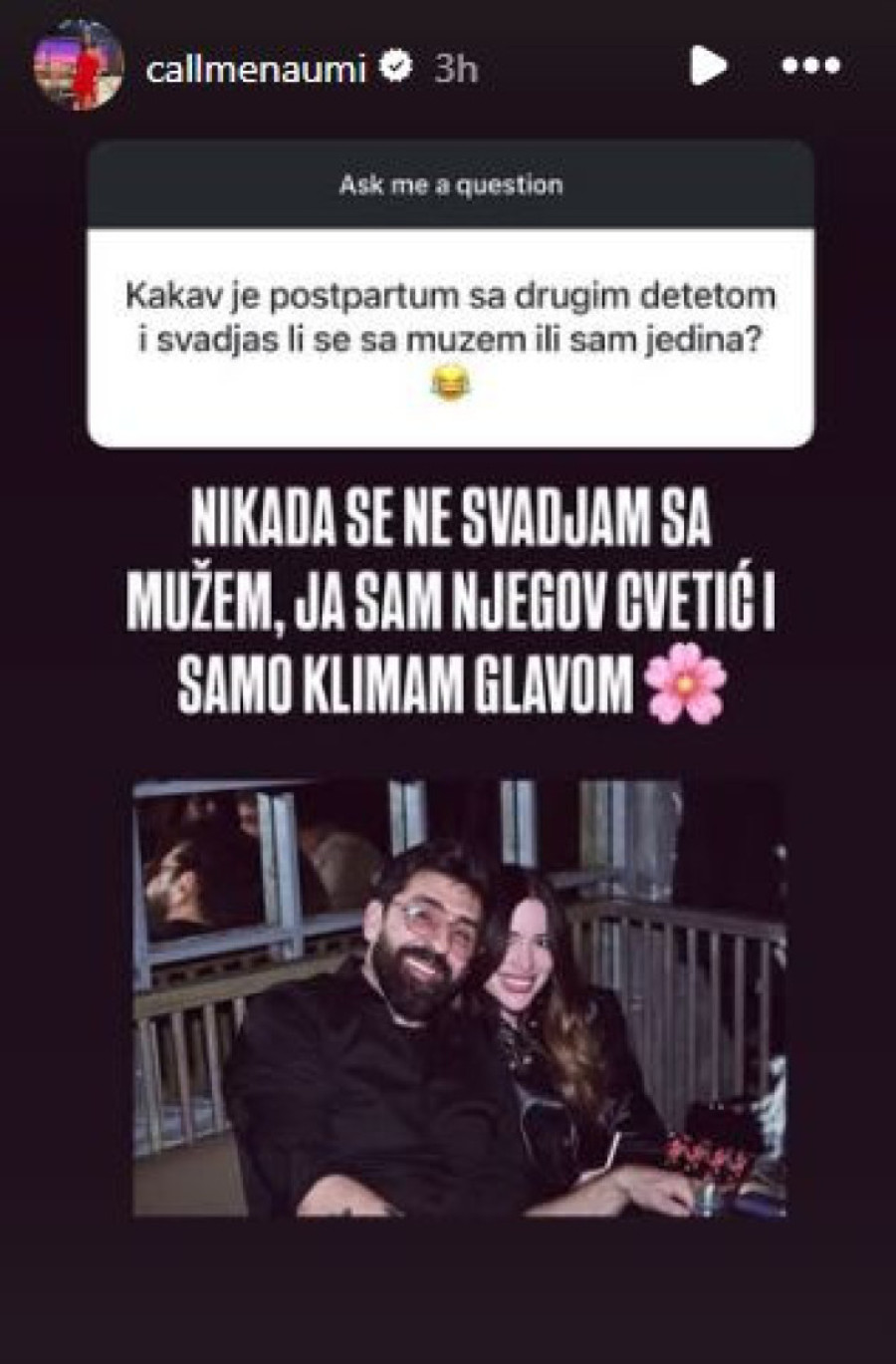 Tokom iste interakcije, inače, Mina je u svom stilu otkrila još neke detalje njihove veze. Na pitanje: "Kakav je postpartum sa drugim detetom i svađaš li se sa mužem ili sam ja jedina?", odgovorila je rekavši: "Nikada se ne svađam sa mužem, ja sam njegov cvetić i samo klimam glavom".
