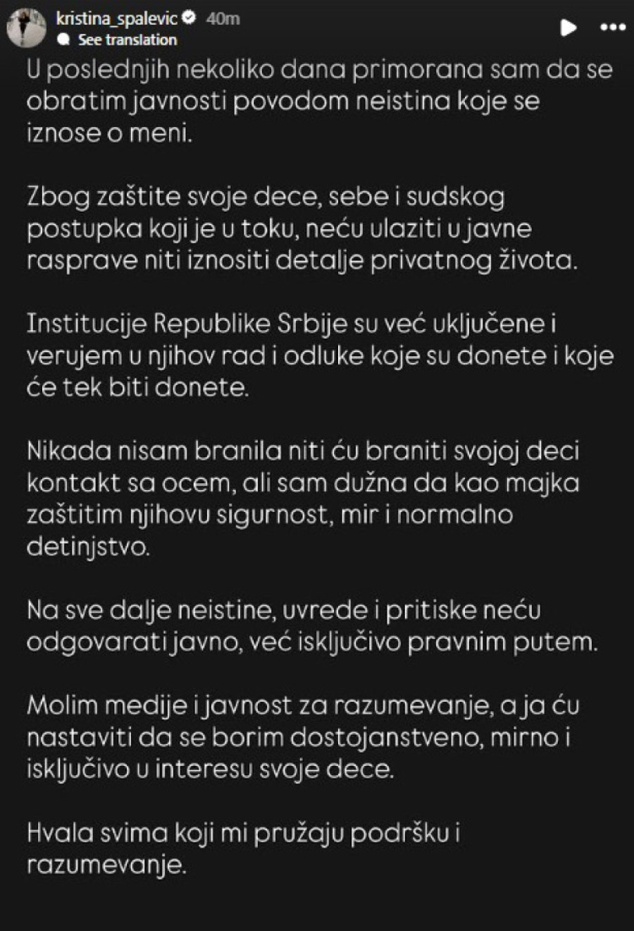 - U poslednjih nekoliko dana primorana sam da se obratim javnosti povodom neistina koje se iznose o meni.Zbog zaštite svoje dece, sebe i sudskog postupka koji je u toku, neću ulaziti u javne rasprave, niti iznositi detalje privatnog života. Institucije Republike Srbije su već uključene i verujem u njihov rad i odluke koje su donete i koje će tek biti donete - pisala je Kristina, čeka vas takođe i u galeriji koja sledi.