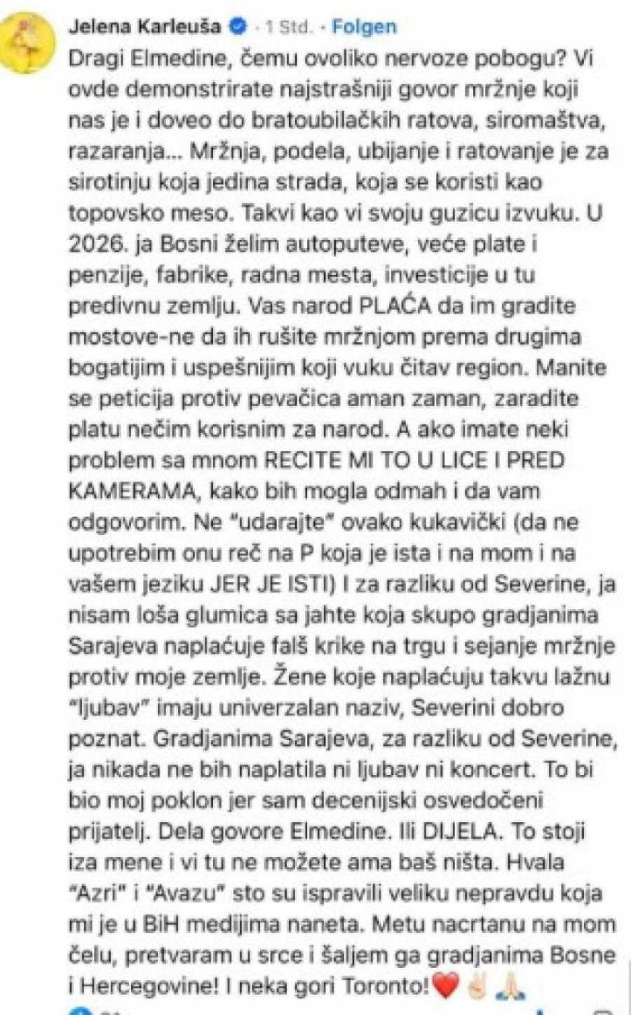 - Dragi Elmedine, čemu ovoliko nervoze pobogu? Vi ovde demonstrirate najstrašniji govor mržnje koji nas je i doveo do bratoubilačkih ratova, siromaštva, razaranja... Mržnja, podela, ubijanje i ratovanje je za sirotinju koja jedina strada, koja se koristi kao topovsko meso. Takvi kao vi svoju guzicu izvuku. U 2026. ja Bosni želim autoputeve, veće plate i penzije, fabrike, radna mesta, investicije u tu predivnu zemlju. Vas narod plaća da im gradite mostove - ne da ih rušite mržnjom prema drugima bogatijim i uspešnijim koji vuku čitav region. Manite se peticija protiv pevačica aman zaman, zaradite platu nečim korisnim za narod. A ako imate neki problem sa mnom recite mi to u lice i pred kamerama, kako bih mogla odmah i da vam odgovorim - poručila je pevačica, pa dodala: