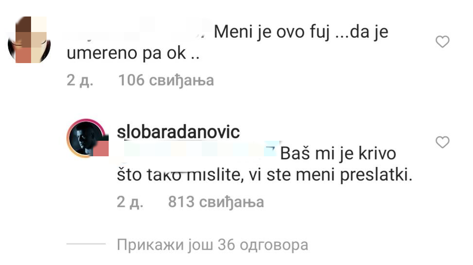 – Meni je ovo fuj… da je umereno, pa ok – napisala je jedna od Slobinih pratiteljki, a onda je usledio i pevačev odgovor.