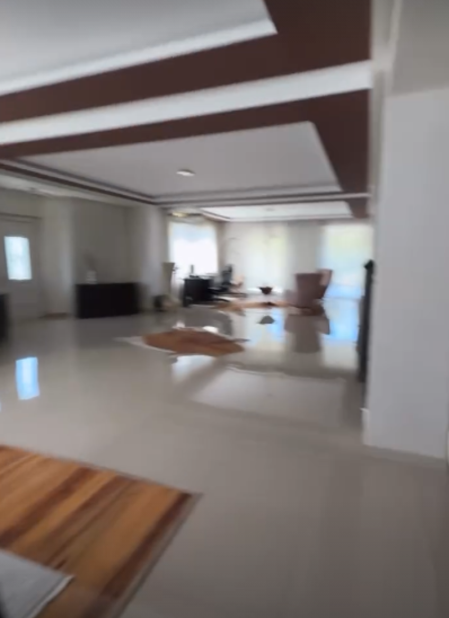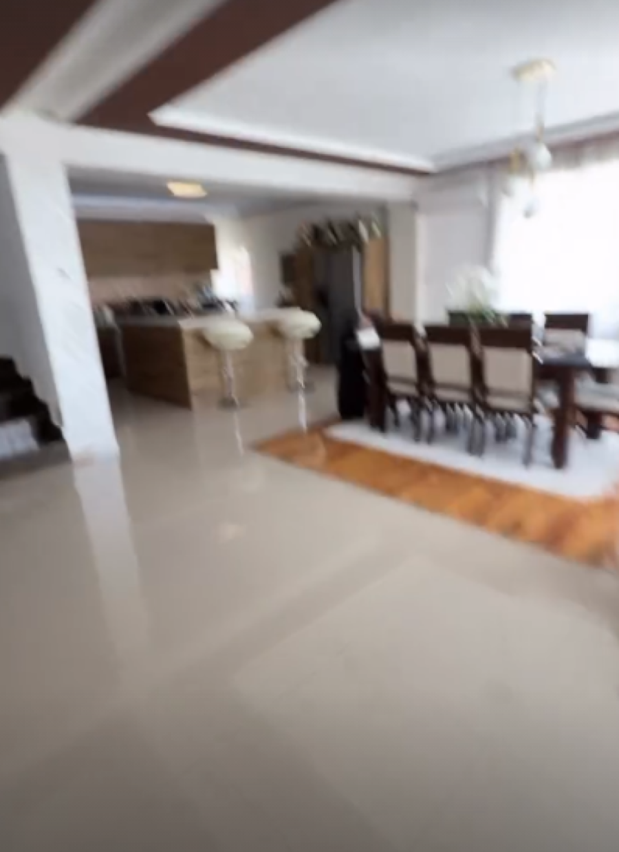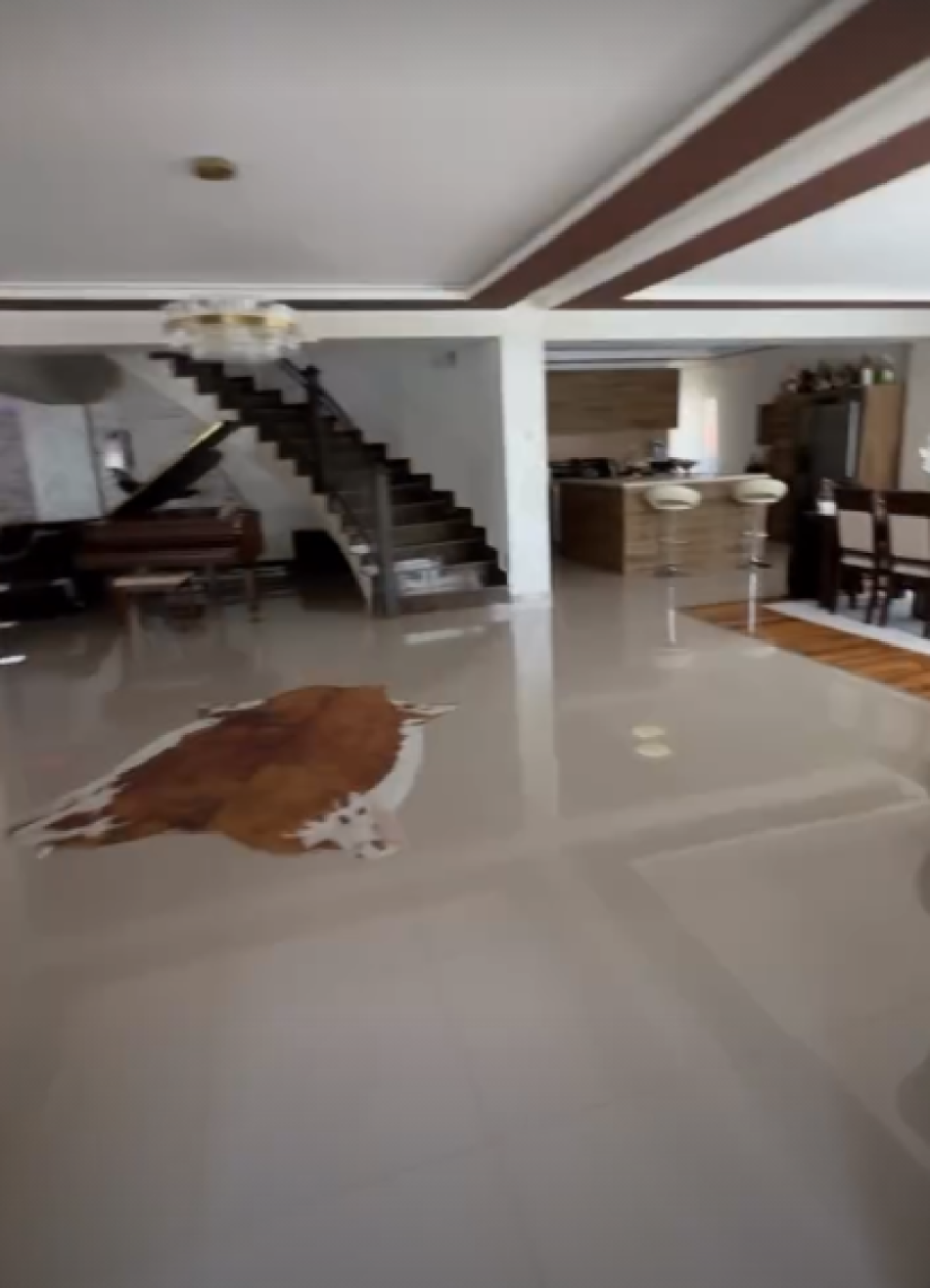 Po ulasku u kuću pogled bukvalno puca na ogroman dnevnu sobu i kuhinju sa trpezarijom. Te dve prostorije dele dugačke stepenice za sprat, dok snevni boravak krasi veliki koncertni klavir.