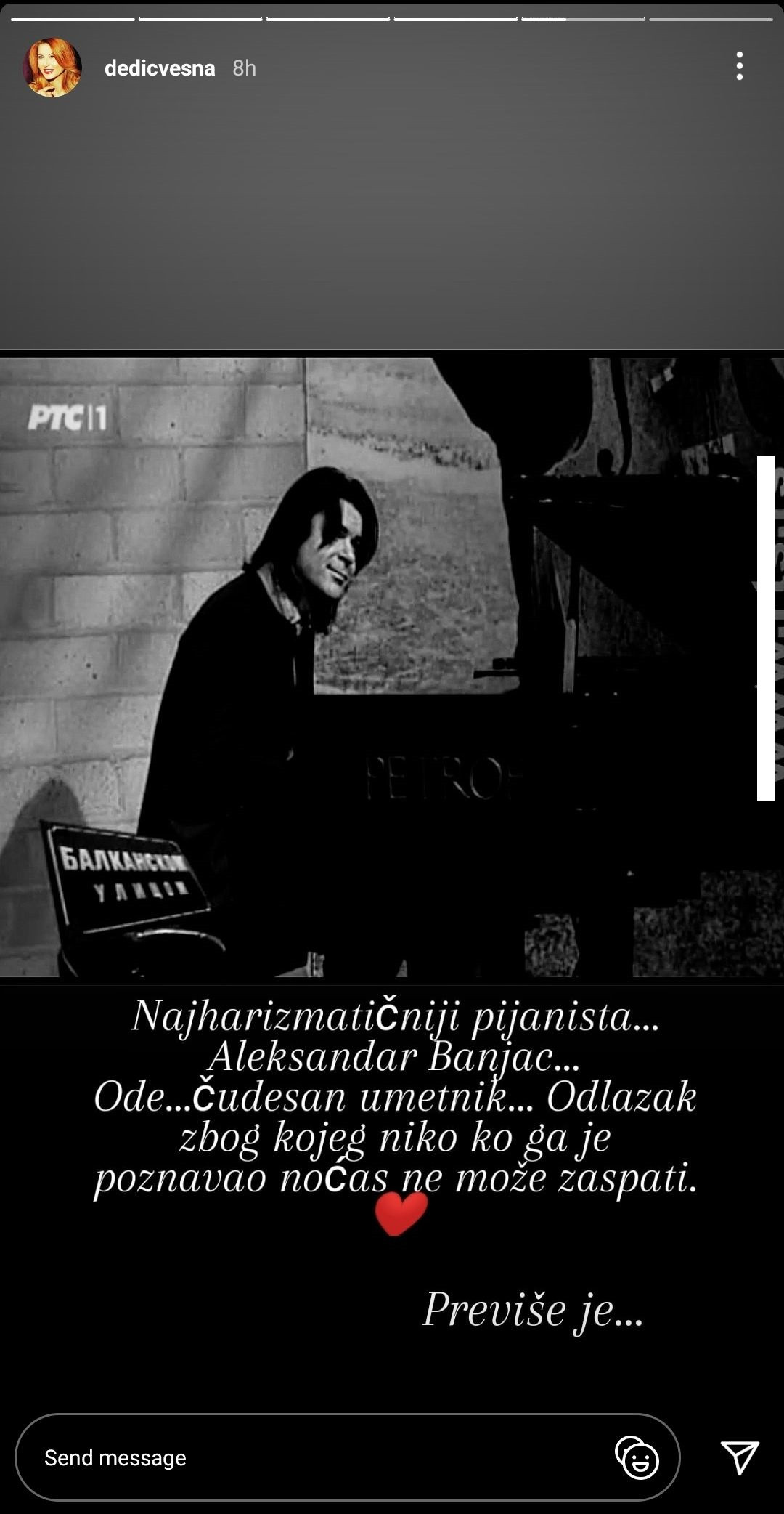 – Poslednji pozdrav iz „Balkanske ulice” čarobnom umetniku, harizmatičnom Aleksandru Banjcu… Ostajem i dalje pri onome što sam rekla na kraju ovog snimka… Ali nema ni para, ni Banjca niti snage da se tako često pozdravljam sa ljudima koji su deo mog emotivnog kapitala… Ulepšao je mnoge moje emisije… Saučešće porodici koja je izgubila tako mladog oca i supruga… – napisala je Vesna Dedić u kratkom nimku na Instagramu.