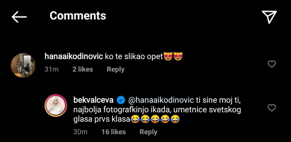 – Ti, sine moj, ti, najbolja fotografkinjo ikada, umetnice svetskog glasa, prva klasa – poručila joj je Bekvalčeva.